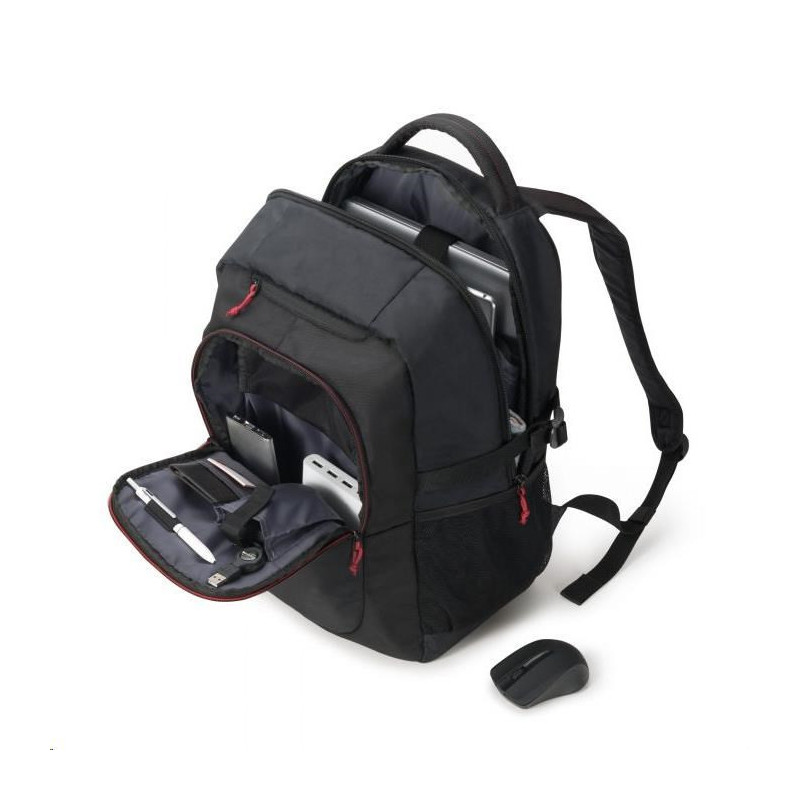 DICOTA Backpack Gain s bezdrátovou myší. Sportovní batoh pro notebook s praktickou bezdrátovou myší. Díky uzamykatelnému prostoru pro notebook vám batoh Gain umožní přenášet notebook bezpečně a pohodlně. Prostorné hlavní oddělení nabízí dostatek prostoru pro ukládání osobních věcí. Příslušenství, jako jsou pera nebo smartphone, lze umístit do přední kapsy.
