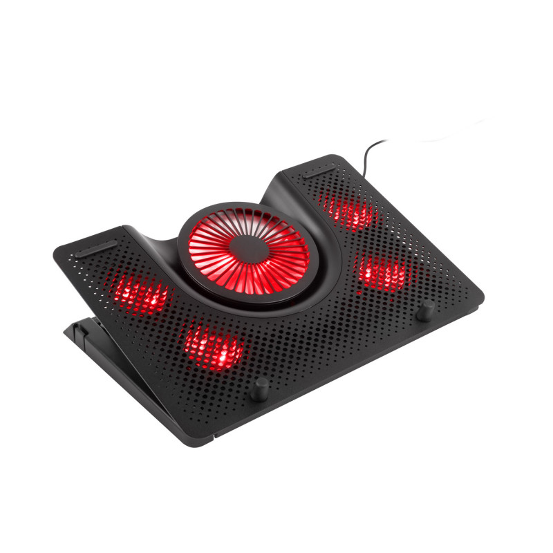 VLASTNOSTI • kompatibilní s notebooky o max. úhlopříčce 17,3" • pět efektivních a tichých ventilátorů s červeným LED podsvícením • unikátní chladicí systém zajišťuje vynikající cirkulaci a vysokou efektivnost • pět úrovní nastavení úhlu sklonu • praktický, odnímatelný držák pro telefon • unikátní herní design • mohutné hliníkové tělo • tichý provoz