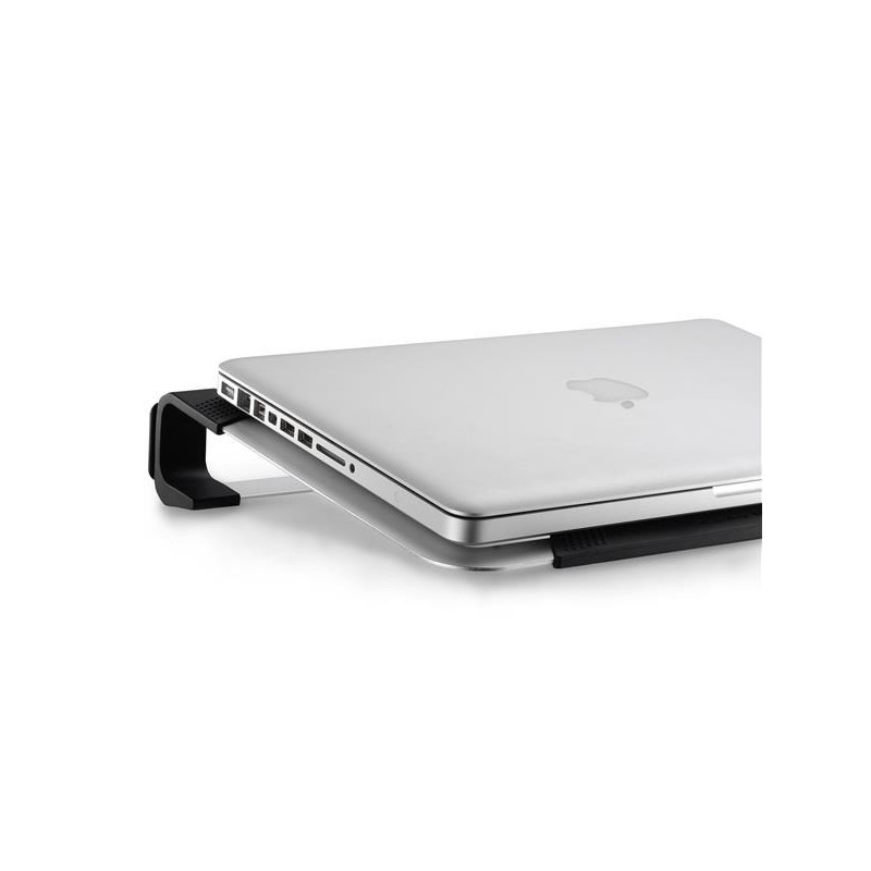 Na zadní straně podložky jsou ucha, na které můžete navinout přebytečnou kabeláž, aby vám při používání nepřekážela. Při přenášení pak lze navíc notebook vložit do těla podložky a zafixovat jej dodávaným popruhem pro bezpečný transport. Při používání pak drží notebook bezpečně na místě zabudované pogumované plochy.