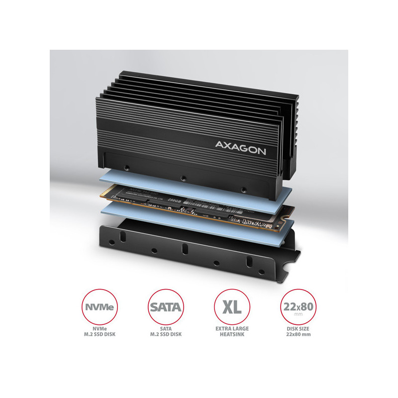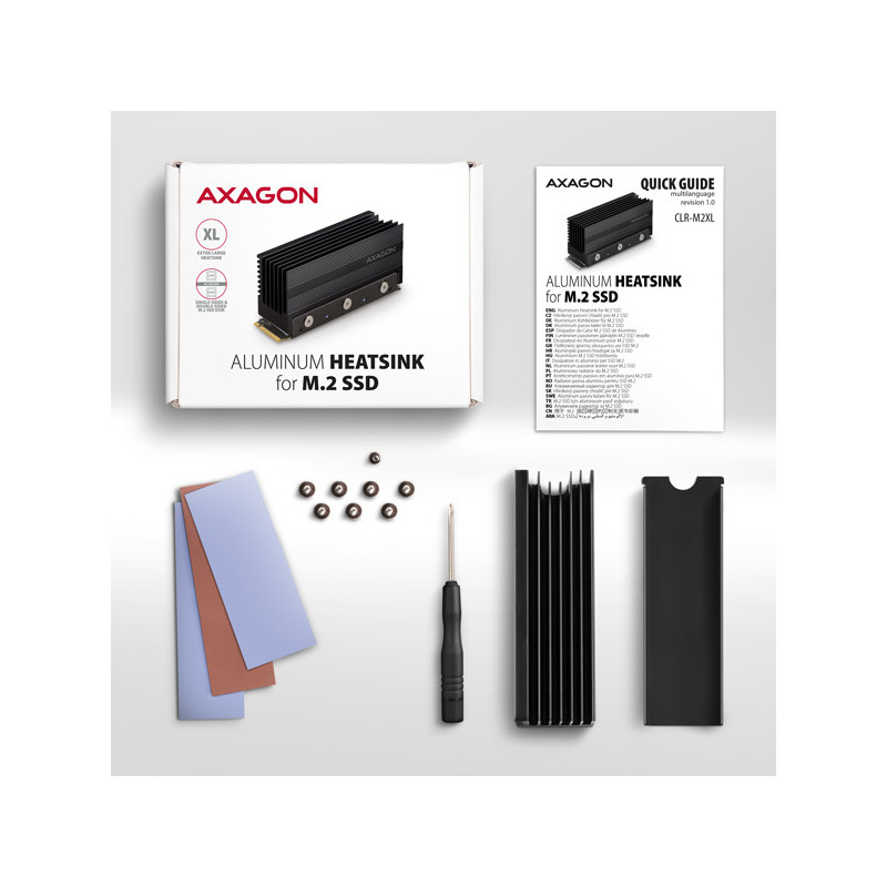 Pasivní hliníkový chladič AXAGON CLR-M2XL ALU pro extrémní chlazení výkonných M.2 SSD disků, zejména NVMe. Univerzální heatsink lze použít na M.2 karty o rozměru 22 x 80 mm. Dodávané teplovodivé podložky, umožní montáž chladiče pro všechny jednostranné i oboustranné M.2 SSD disky.