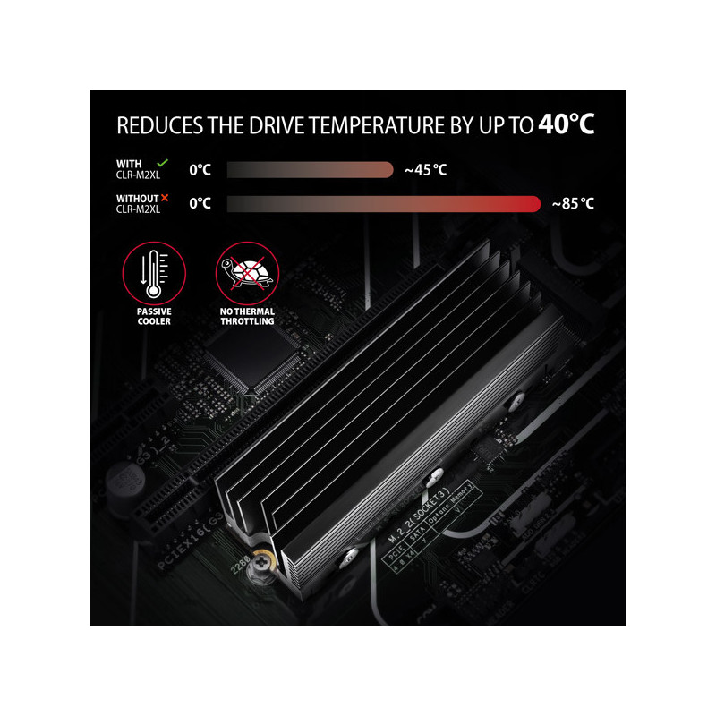 Žebrovaný hliníkový XL pasiv vysoký 32 mm, spolu s kovovým rámečkem, napomáhá optimálně odvádět teplo vzniklé při provozu M.2 SSD disku a umožňuje tak snížit teplotu disku až o 40 °C. Prodlužuje se tak životnost SSD disku a zamezí odepsat zpomalování rychlosti disku tzv. „Thermal Throttling“.
