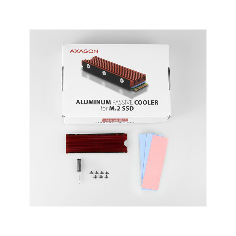 Pasivní chladič AXAGON CLR-M2 ALU pro ideální chlazení výkonných M.2 SSD disků. Univerzální pasivní cooler lze použít na M.2 karty o rozměru 22 x 80 mm. Pět dodávaných teplovodivých podložek s různou tloušťkou, umožní montáž chladiče pro všechny jednostranné i oboustranné M.2 SSD disky.