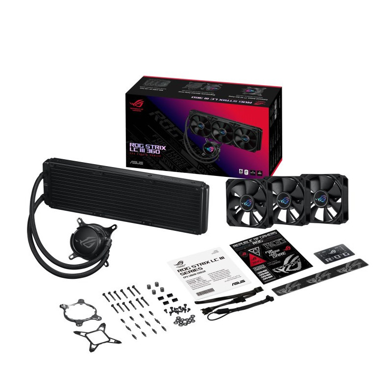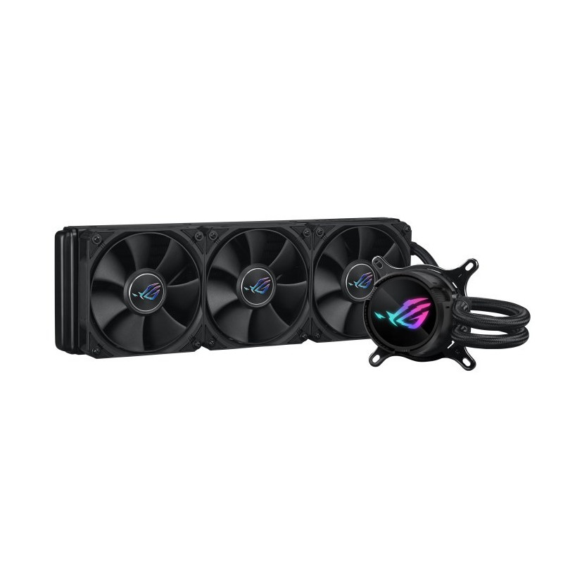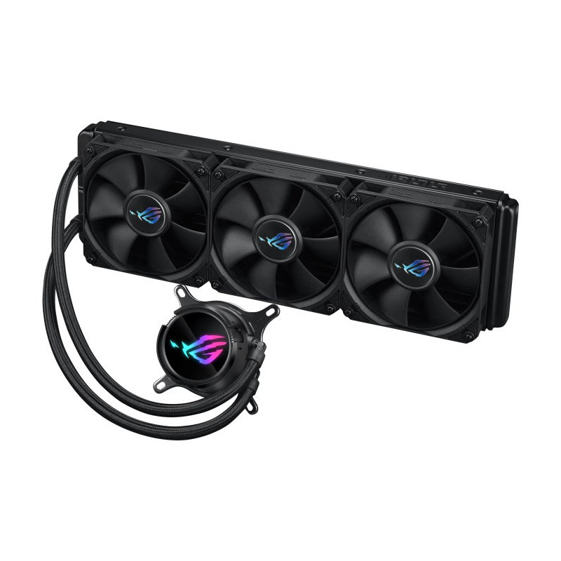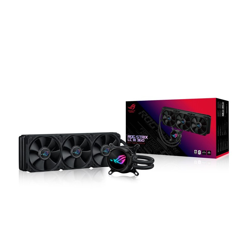 Kapalný chladič CPU ROG Strix LC III vše v jednom s vodním blokem otočným o 360°, novou pumpou Asetek Gen7 v2, prémiovými ventilátory ROG a více než 10 vlastními světelnými efekty Aura.