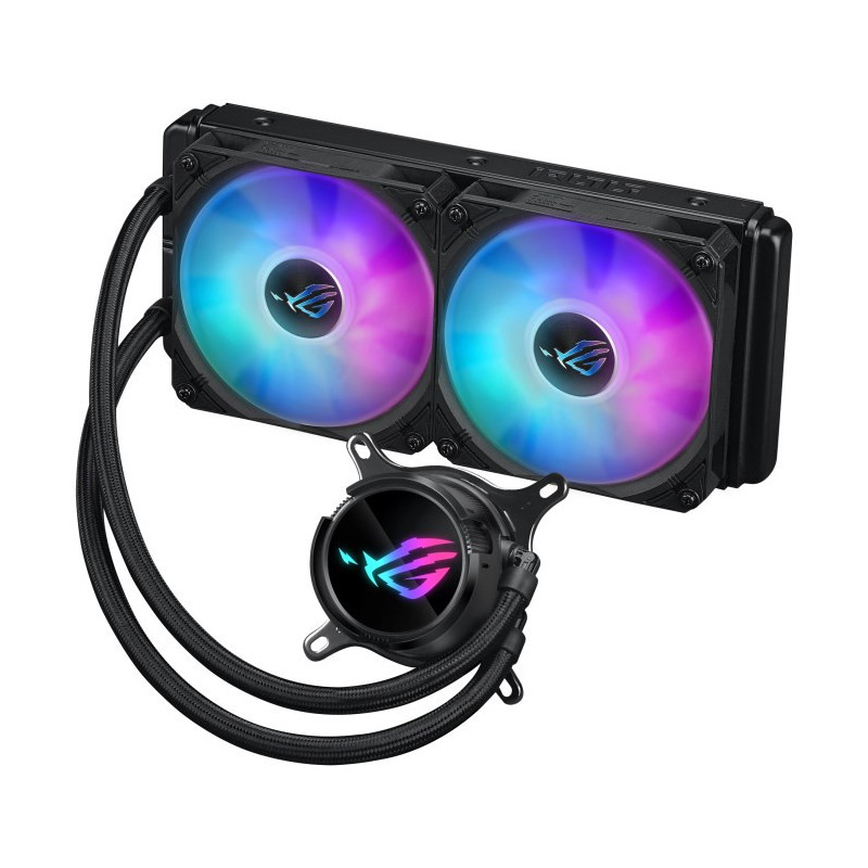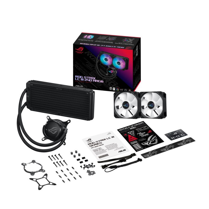 Kapalný chladič CPU ROG Strix LC III ARGB all-in-one s vodním blokem otočným o 360°, novou pumpou Asetek Gen7 v2, prémiovými ventilátory ROG ARGB a více než 10 vlastními světelnými efekty Aura.