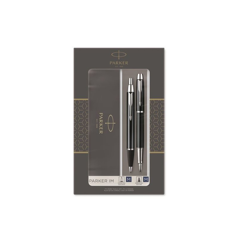 Dárková sada Parker IM plnicí pero + kuličkové pero*Řada Parker IM přináší kuličkové a plnicí pero s elegantním kovovým tělem a jednoduchým designem *Kuličkové pero má lesklý černý lak a chromové doplňky *Modrý inkoust *Šíře stopy: 0,5 mm *Baleno v dárkové krabičce Parker