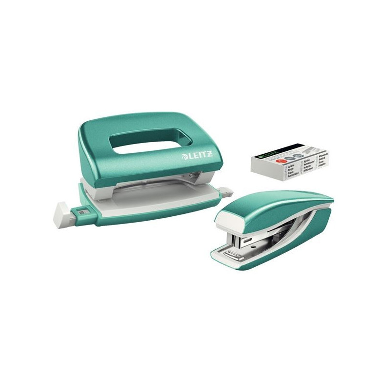 *Sada celokovové mini sešívačky a děrovačky v metalických barvách*Uzavřené sešívání; horní plnění drátků*Součástí je startovací balení drátků (1 000 ks)*Příložník pro všechny standardní formáty: A4, A5, A6*Rozměry: 6,7 × 7,1 × 10,0 cm (š × v × h) (děrovačka); 4,3 × 2,9 × 9,8 cm (š × v × h), hloubka vkládání: 4,0 cm (sešívačka)*Výkon 10 listů; drátky No. 10