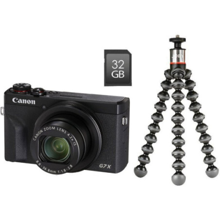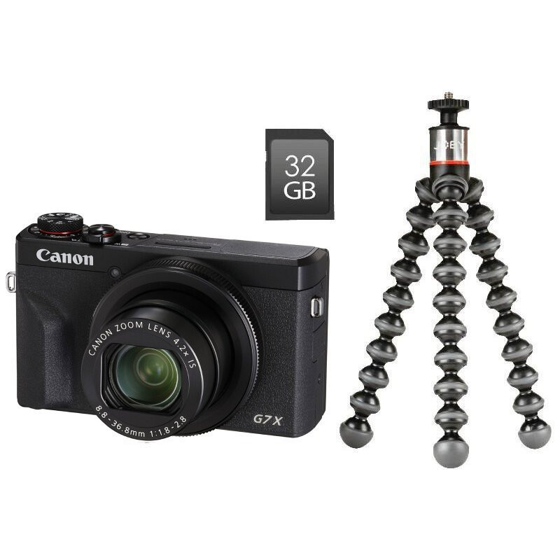Vlogger kit obsahuje samotný fotoaparát, akumulátor, nabíječku, řemínek na zápěstí, SD kartu, stativ