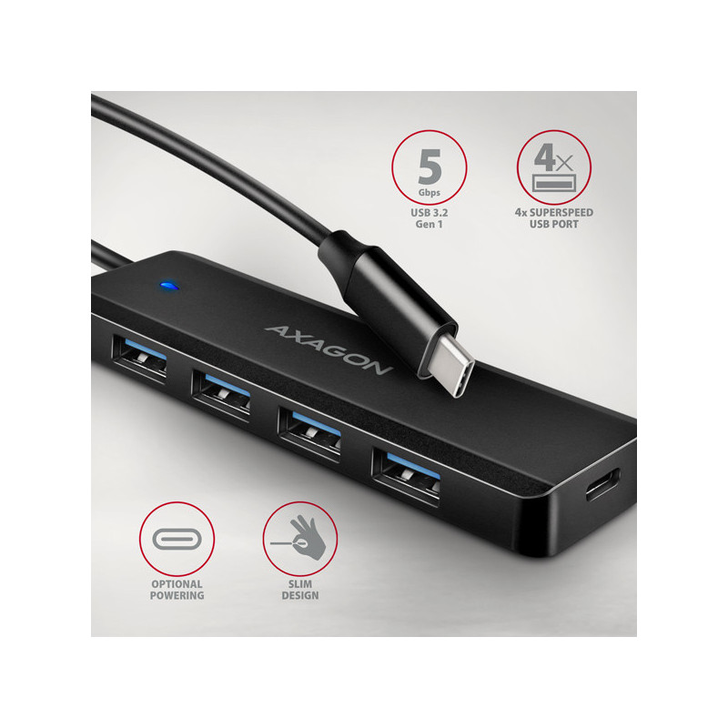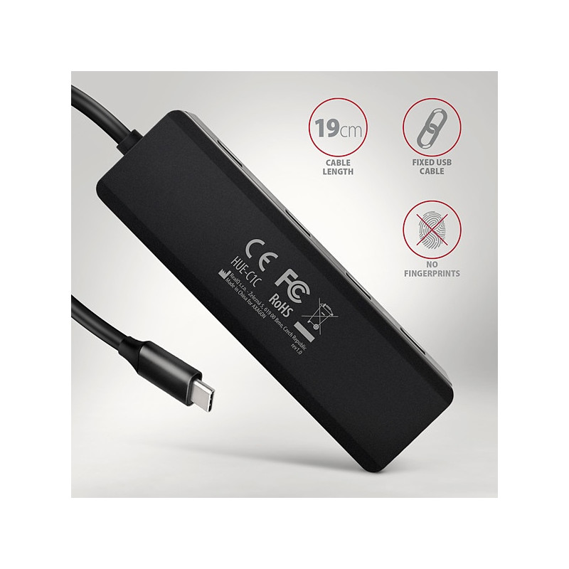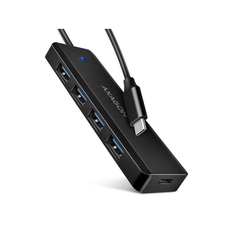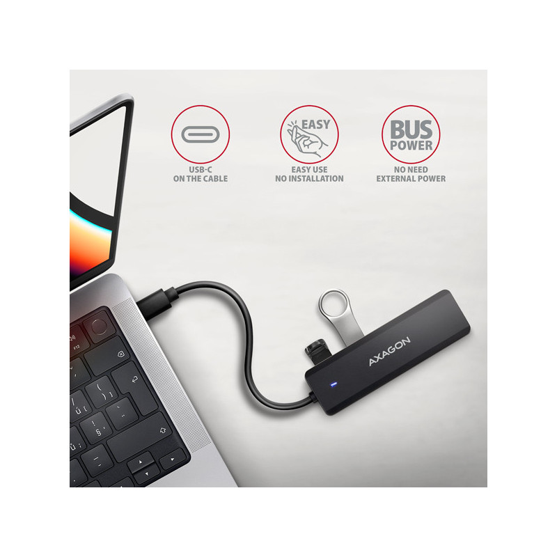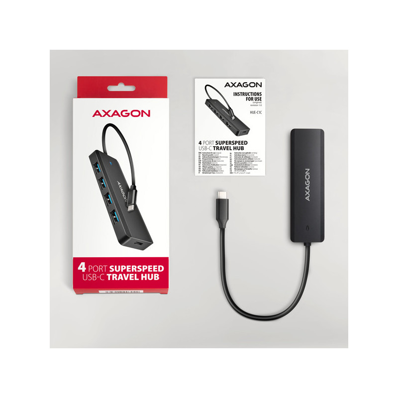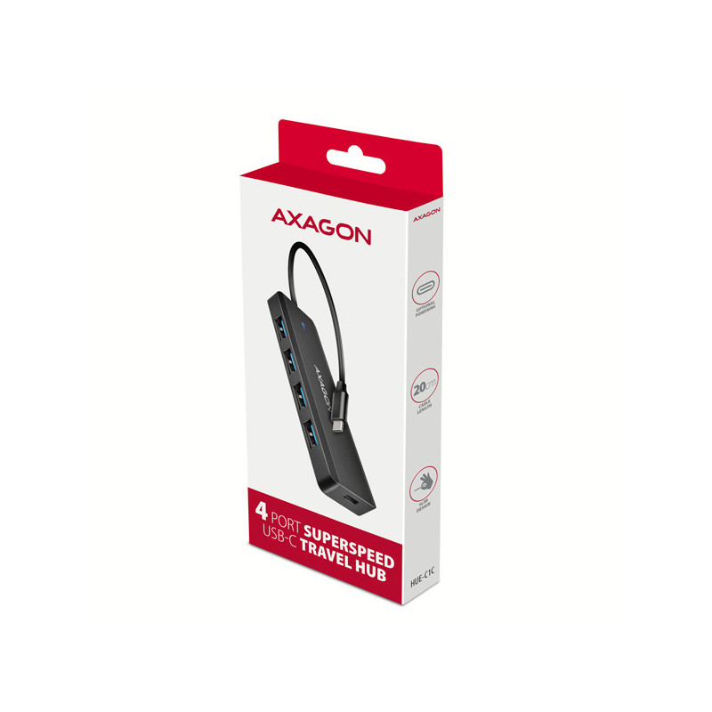 Cestovní USB-C 5Gbps hub AXAGON HUE-C1C snadno a rychle připojí k notebooku nebo počítači až čtyři USB zařízení současně. Napevno uchycený USB-C kabel délky 19 cm je ideální pro uživatele mobilních zařízení. Standard USB 3.2 Gen 1 umožní přenosovou rychlost až 5Gb/s.