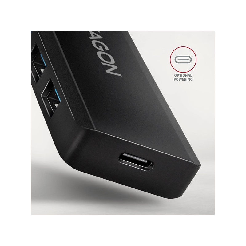 Všestrannost tohoto kompaktního USB hubu zvyšuje vestavěný USB-C konektor pro dodatečné napájení ze standardních USB nabíječek dodávaných k mobilním telefonům. Díky tomuto přídavnému napájení lze například připojit ještě více externích disků k počítači nebo zvýšit počet nabíjených mobilních telefonů. I bez externího napájení hub zvládne trvalé připojení několika externích disků.