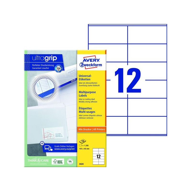 *Inovativní technologie ultragrip na zadní straně archu zajišťuje bezchybné natažení archu etiket a tisk bez zasekávání archu etiket v tiskárně *Univerzální bílé etikety jsou určeny pro každodenní použití na listovní zásilky a balíky, na označování, číslování, oceňování sortimentu či výrobků *Formáty A6, A5, A4 lze použít k nejrůznějším plošným aplikacím *Etikety mají speciální lemování, které zabraňuje zanášení tiskárny lepidlem *Na etikety se jednoduše tiskne a mají dlouhodobou přilnavost *Etikety jsou ekologicky šetrné a mohou být plně recyklovatelné jako součást běžného papírového odpadu *FSC certifikované etikety jsou vyráběny z papíru ze šetrně spravovaných a obnovitelných lesů *Vhodné pro inkoustové, laserové tiskárny a kopírovací stroje *Díky technologii QuickPEEL™ jsou etikety snadno snímatelné z archu *Online šablony a software zdarma ke stažení na www.avery-zweckform.cz