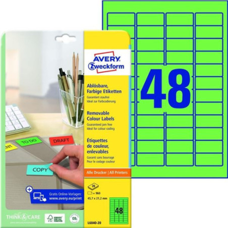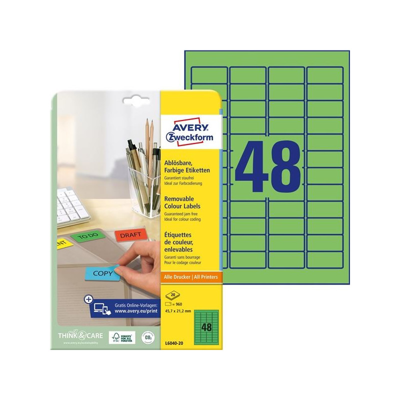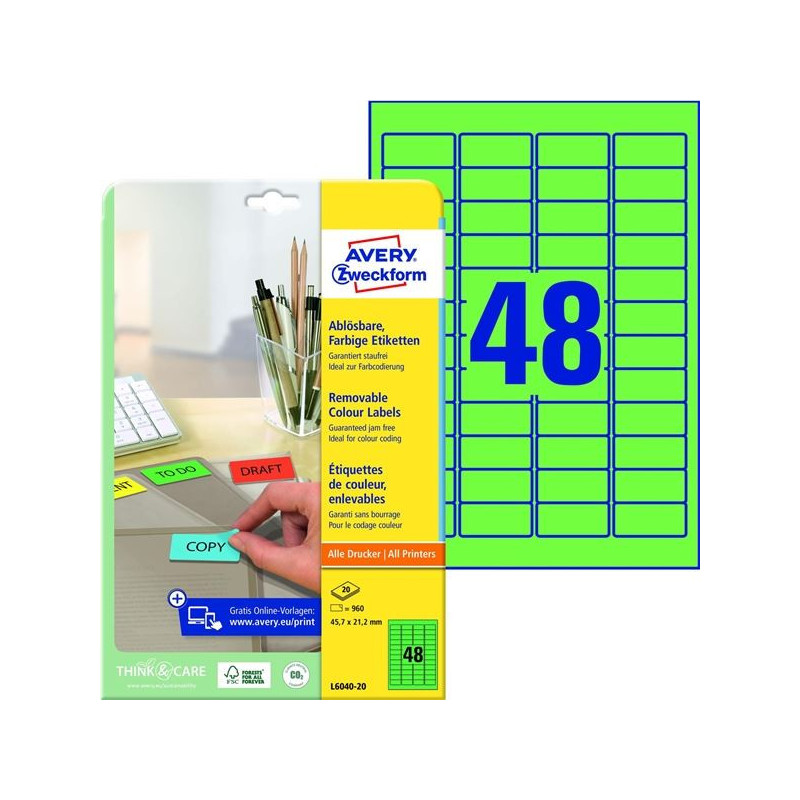 *Etikety dobře drží, zároveň se dají snadno odlepit bez zanechání zbytků lepidla díky technologii Stick&Lift *Jsou ideální pro jakékoliv krátkodobé označování např. složek či poznámek *Umístění etiket se dá na běžně používaných površích několikrát upravit (např. šanonech, elektronickém vybavení, sklu, kovu nebo plastech)*Vhodné pro inkoustové, laserové tiskárny a kopírovací stroje* Nabízíme ve 4 barevných variantách *Rozměr etiket: 45,7 x 21,2 mm; 48 etiket na archu; 20 archů *Online šablony a software zdarma ke stažení na www.avery-zweckform.cz.