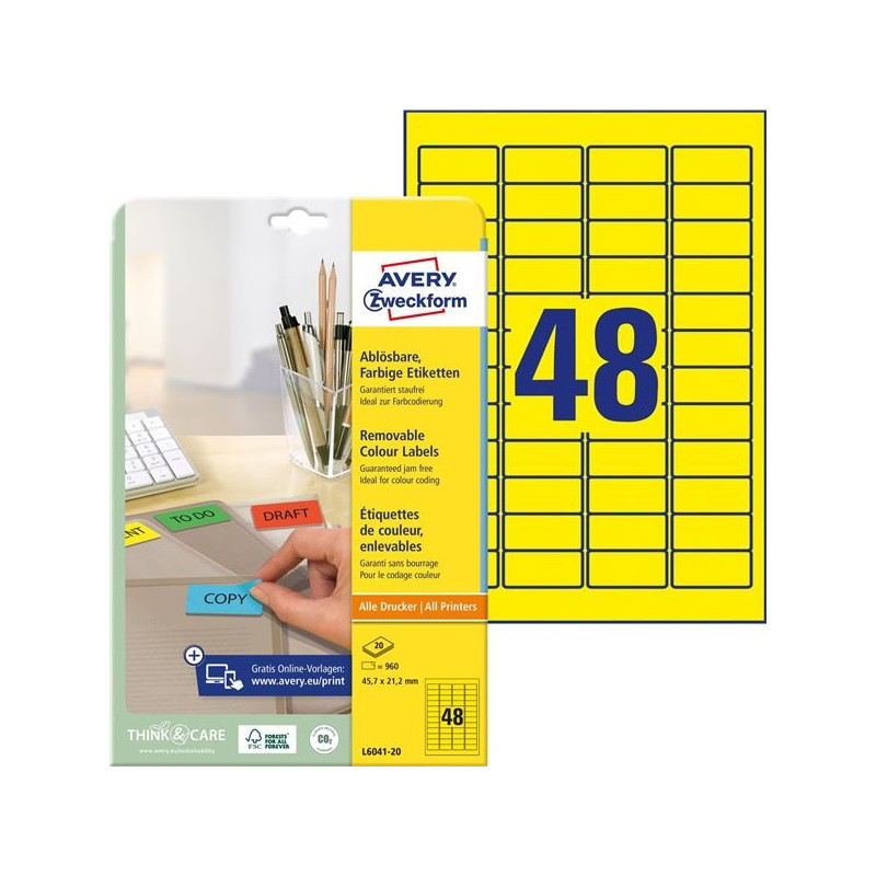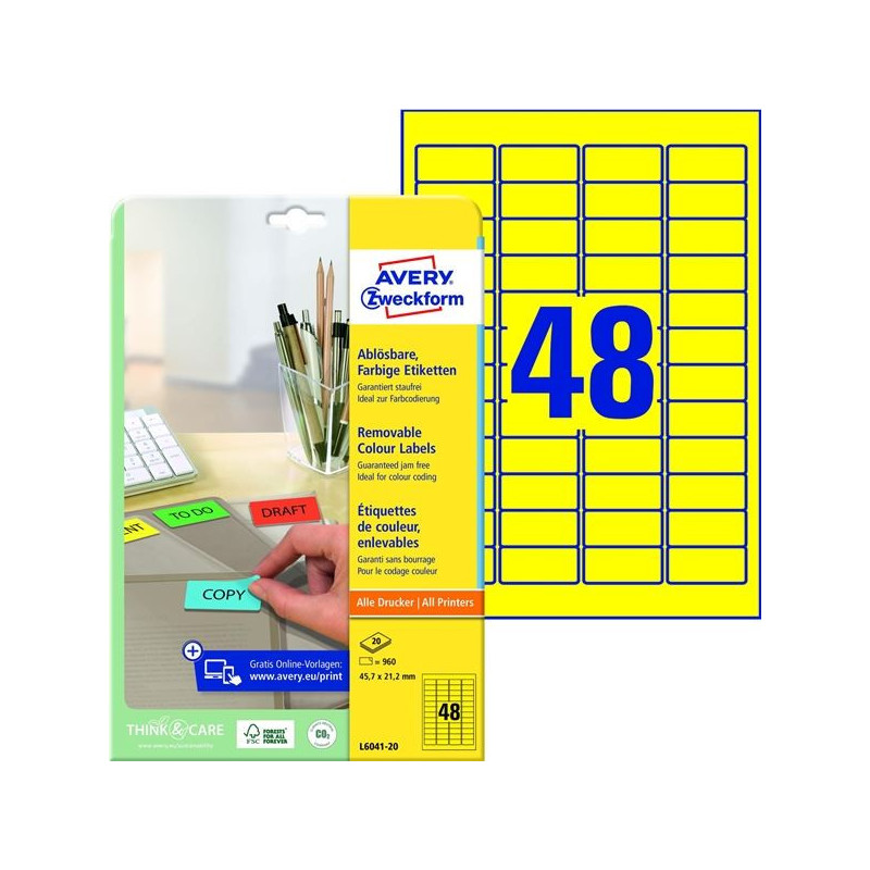*Etikety dobře drží, zároveň se dají snadno odlepit bez zanechání zbytků lepidla díky technologii Stick&Lift *Jsou ideální pro jakékoliv krátkodobé označování např. složek či poznámek *Umístění etiket se dá na běžně používaných površích několikrát upravit (např. šanonech, elektronickém vybavení, sklu, kovu nebo plastech)*Vhodné pro inkoustové, laserové tiskárny a kopírovací stroje *Nabízíme ve 4 barevných variantách *Rozměr etiket: 45,7 x 21,2 mm; 48 etiket na archu; 20 archů *Online šablony a software zdarma ke stažení na www.avery-zweckform.cz.
