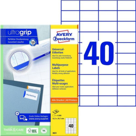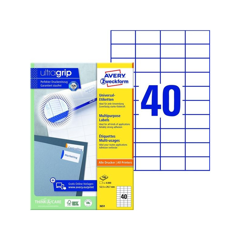 *Inovativní technologie ultragrip na zadní straně archu zajišťuje bezchybné natažení archu etiket a tisk bez zasekávání archu etiket v tiskárně *Univerzální bílé etikety jsou určeny pro každodenní použití na listovní zásilky a balíky, na označování, číslování, oceňování sortimentu či výrobků *Formáty A6, A5, A4 lze použít k nejrůznějším plošným aplikacím *Etikety mají speciální lemování, které zabraňuje zanášení tiskárny lepidlem *Na etikety se jednoduše tiskne a mají dlouhodobou přilnavost *Etikety jsou ekologicky šetrné a mohou být plně recyklovatelné jako součást běžného papírového odpadu *FSC certifikované etikety jsou vyráběny z papíru ze šetrně spravovaných a obnovitelných lesů *Vhodné pro inkoustové, laserové tiskárny a kopírovací stroje *Díky technologii QuickPEEL™ jsou etikety snadno snímatelné z archu *Online šablony a software zdarma ke stažení na www.avery-zweckform.cz