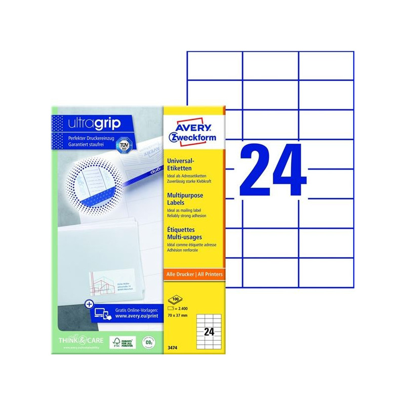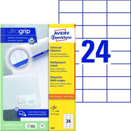*Inovativní technologie ultragrip na zadní straně archu zajišťuje bezchybné natažení archu etiket a tisk bez zasekávání archu etiket v tiskárně *Univerzální bílé etikety jsou určeny pro každodenní použití na listovní zásilky a balíky, na označování, číslování, oceňování sortimentu či výrobků *Formáty A6, A5, A4 lze použít k nejrůznějším plošným aplikacím *Etikety mají speciální lemování, které zabraňuje zanášení tiskárny lepidlem *Na etikety se jednoduše tiskne a mají dlouhodobou přilnavost *Etikety jsou ekologicky šetrné a mohou být plně recyklovatelné jako součást běžného papírového odpadu *FSC certifikované etikety jsou vyráběny z papíru ze šetrně spravovaných a obnovitelných lesů *Vhodné pro inkoustové, laserové tiskárny a kopírovací stroje *Díky technologii QuickPEEL™ jsou etikety snadno snímatelné z archu *Online šablony a software zdarma ke stažení na www.avery-zweckform.cz