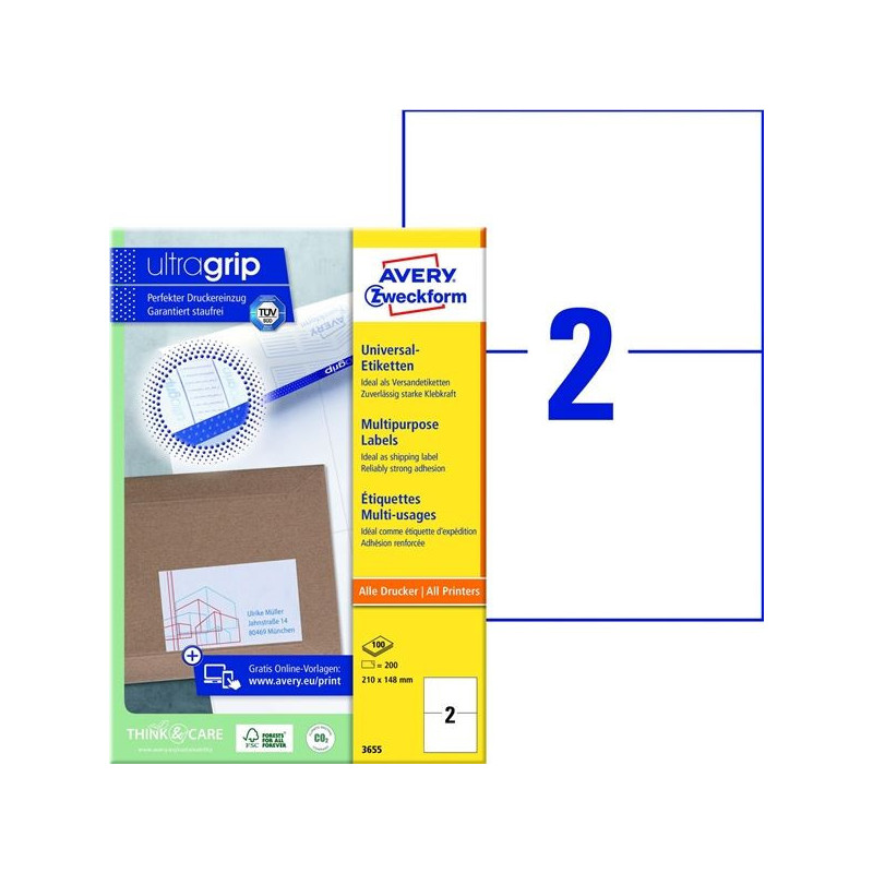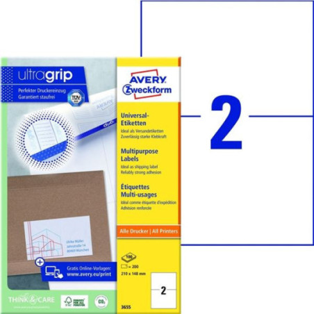 *Inovativní technologie ultragrip na zadní straně archu zajišťuje bezchybné natažení archu etiket a tisk bez zasekávání archu etiket v tiskárně *Univerzální bílé etikety jsou určeny pro každodenní použití na listovní zásilky a balíky, na označování, číslování, oceňování sortimentu či výrobků *Formáty A6, A5, A4 lze použít k nejrůznějším plošným aplikacím *Etikety mají speciální lemování, které zabraňuje zanášení tiskárny lepidlem *Na etikety se jednoduše tiskne a mají dlouhodobou přilnavost *Etikety jsou ekologicky šetrné a mohou být plně recyklovatelné jako součást běžného papírového odpadu *FSC certifikované etikety jsou vyráběny z papíru ze šetrně spravovaných a obnovitelných lesů *Vhodné pro inkoustové, laserové tiskárny a kopírovací stroje *Díky technologii QuickPEEL™ jsou etikety snadno snímatelné z archu *Online šablony a software zdarma ke stažení na www.avery-zweckform.cz