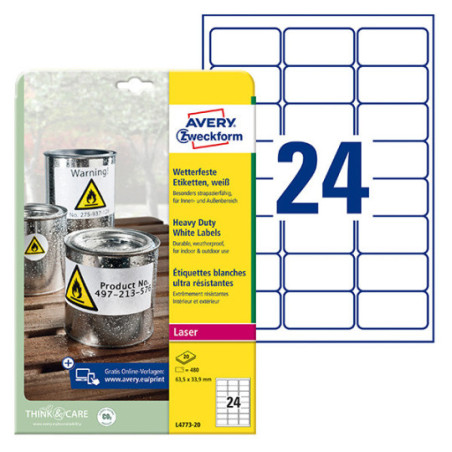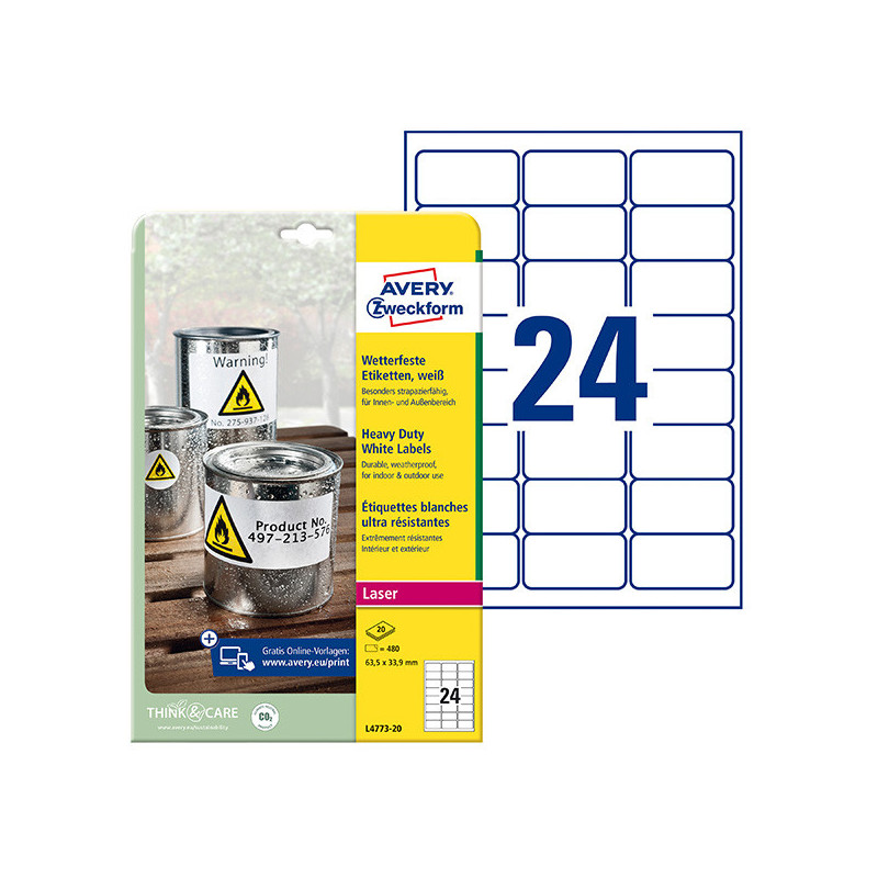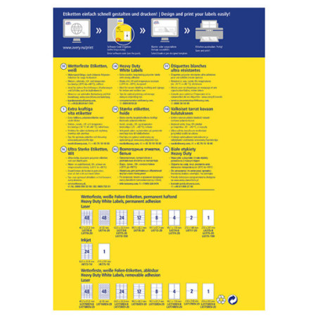 *Velmi odolné polyesterové etikety *Ideální pro trvalé označení majetku, výrobků varovné nápisy či instrukce *Odolné vůči prachu, natržení, vodě, UV záření a vlivům počasí a teplotním změnám -20 °C do +80 °C *Vhodné pro černobílé laserové tiskárny, barevné laserové tiskárny a kopírovací stroje *Na etikety lze psát propiskou či lihovým fixem - text je poté trvalý. Při použití fixu na bílé tabule lze text poté z etikety odstranit *Online šablony a software zdarma ke stažení na www.avery-zweckform.cz