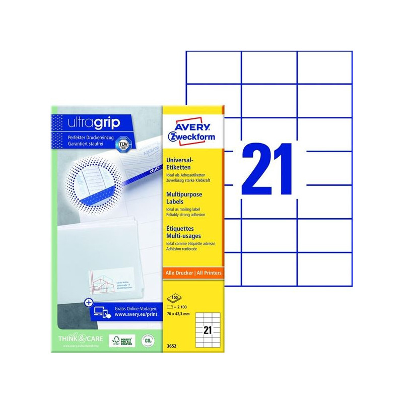 *Inovativní technologie ultragrip na zadní straně archu zajišťuje bezchybné natažení archu etiket a tisk bez zasekávání archu etiket v tiskárně *Univerzální bílé etikety jsou určeny pro každodenní použití na listovní zásilky a balíky, na označování, číslování, oceňování sortimentu či výrobků *Formáty A6, A5, A4 lze použít k nejrůznějším plošným aplikacím *Etikety mají speciální lemování, které zabraňuje zanášení tiskárny lepidlem *Na etikety se jednoduše tiskne a mají dlouhodobou přilnavost *Etikety jsou ekologicky šetrné a mohou být plně recyklovatelné jako součást běžného papírového odpadu *FSC certifikované etikety jsou vyráběny z papíru ze šetrně spravovaných a obnovitelných lesů *Vhodné pro inkoustové, laserové tiskárny a kopírovací stroje *Díky technologii QuickPEEL™ jsou etikety snadno snímatelné z archu *Online šablony a software zdarma ke stažení na www.avery-zweckform.cz