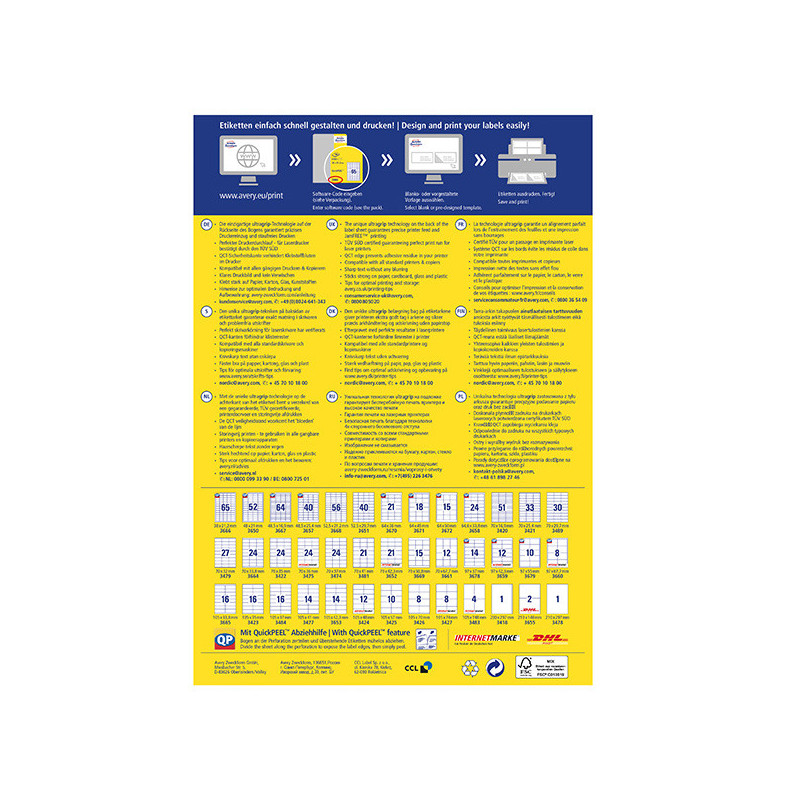 *Inovativní technologie ultragrip na zadní straně archu zajišťuje bezchybné natažení archu etiket a tisk bez zasekávání archu etiket v tiskárně *Univerzální bílé etikety jsou určeny pro každodenní použití na listovní zásilky a balíky, na označování, číslování, oceňování sortimentu či výrobků *Formáty A6, A5, A4 lze použít k nejrůznějším plošným aplikacím *Etikety mají speciální lemování, které zabraňuje zanášení tiskárny lepidlem *Na etikety se jednoduše tiskne a mají dlouhodobou přilnavost *Etikety jsou ekologicky šetrné a mohou být plně recyklovatelné jako součást běžného papírového odpadu *FSC certifikované etikety jsou vyráběny z papíru ze šetrně spravovaných a obnovitelných lesů *Vhodné pro inkoustové, laserové tiskárny a kopírovací stroje *Díky technologii QuickPEEL™ jsou etikety snadno snímatelné z archu *Online šablony a software zdarma ke stažení na www.avery-zweckform.cz