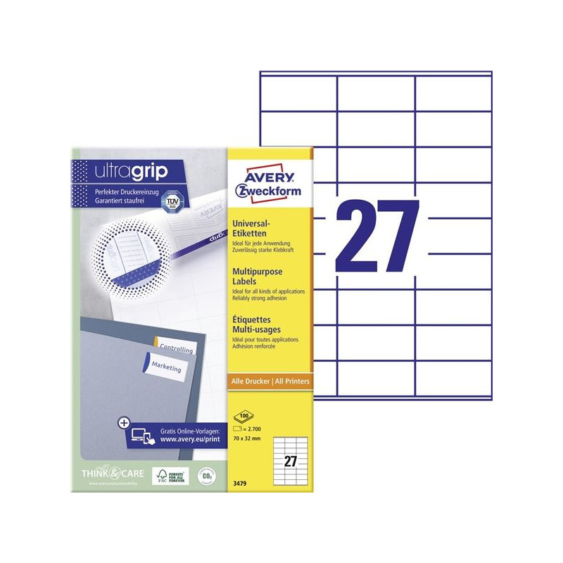*Inovativní technologie ultragrip na zadní straně archu zajišťuje bezchybné natažení archu etiket a tisk bez zasekávání archu etiket v tiskárně *Univerzální bílé etikety jsou určeny pro každodenní použití na listovní zásilky a balíky, na označování, číslování, oceňování sortimentu či výrobků *Formáty A6, A5, A4 lze použít k nejrůznějším plošným aplikacím *Etikety mají speciální lemování, které zabraňuje zanášení tiskárny lepidlem *Na etikety se jednoduše tiskne a mají dlouhodobou přilnavost *Etikety jsou ekologicky šetrné a mohou být plně recyklovatelné jako součást běžného papírového odpadu *FSC certifikované etikety jsou vyráběny z papíru ze šetrně spravovaných a obnovitelných lesů *Vhodné pro inkoustové, laserové tiskárny a kopírovací stroje *Online šablony a software zdarma na www.avery-zweckform.cz