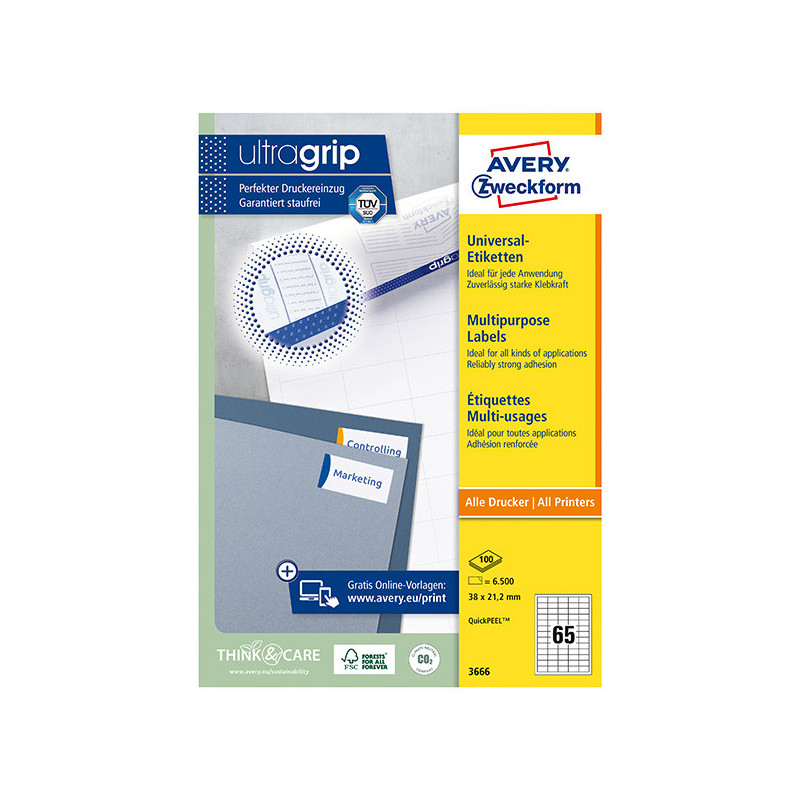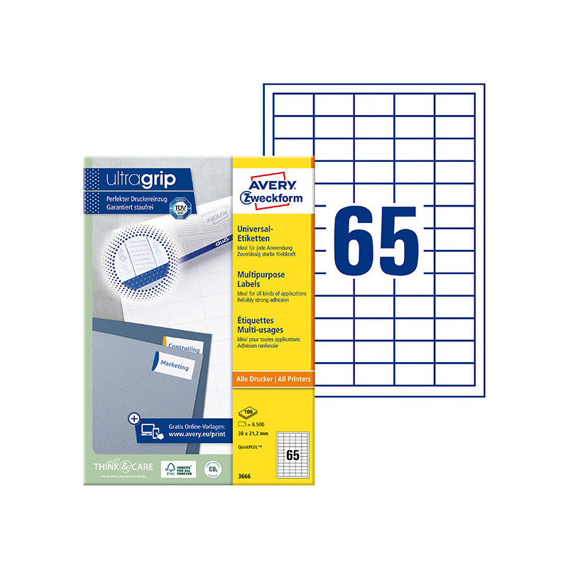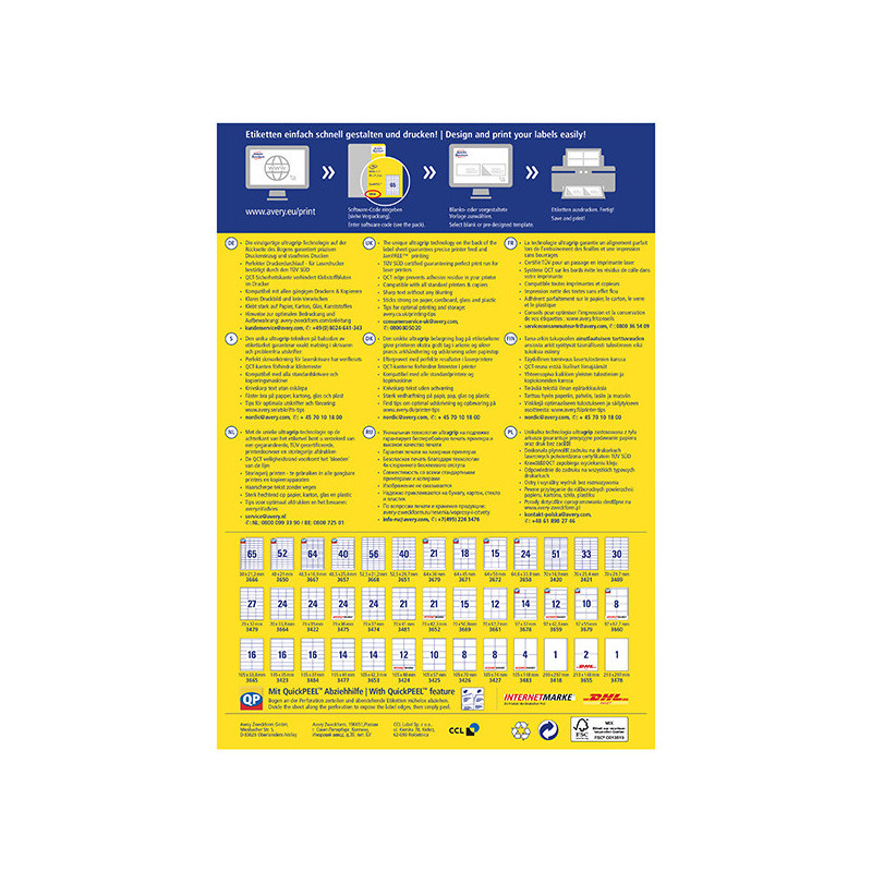 *Inovativní technologie ultragrip na zadní straně archu zajišťuje bezchybné natažení archu etiket a tisk bez zasekávání archu etiket v tiskárně *Univerzální bílé etikety jsou určeny pro každodenní použití na listovní zásilky a balíky, na označování, číslování, oceňování sortimentu či výrobků *Formáty A6, A5, A4 lze použít k nejrůznějším plošným aplikacím *Etikety mají speciální lemování, které zabraňuje zanášení tiskárny lepidlem *Na etikety se jednoduše tiskne a mají dlouhodobou přilnavost *Etikety jsou ekologicky šetrné a mohou být plně recyklovatelné jako součást běžného papírového odpadu *FSC certifikované etikety jsou vyráběny z papíru ze šetrně spravovaných a obnovitelných lesů *Vhodné pro inkoustové, laserové tiskárny a kopírovací stroje *Díky technologii QuickPEEL™ jsou etikety snadno snímatelné z archu *Online šablony a software zdarma ke stažení na www.avery-zweckform.cz