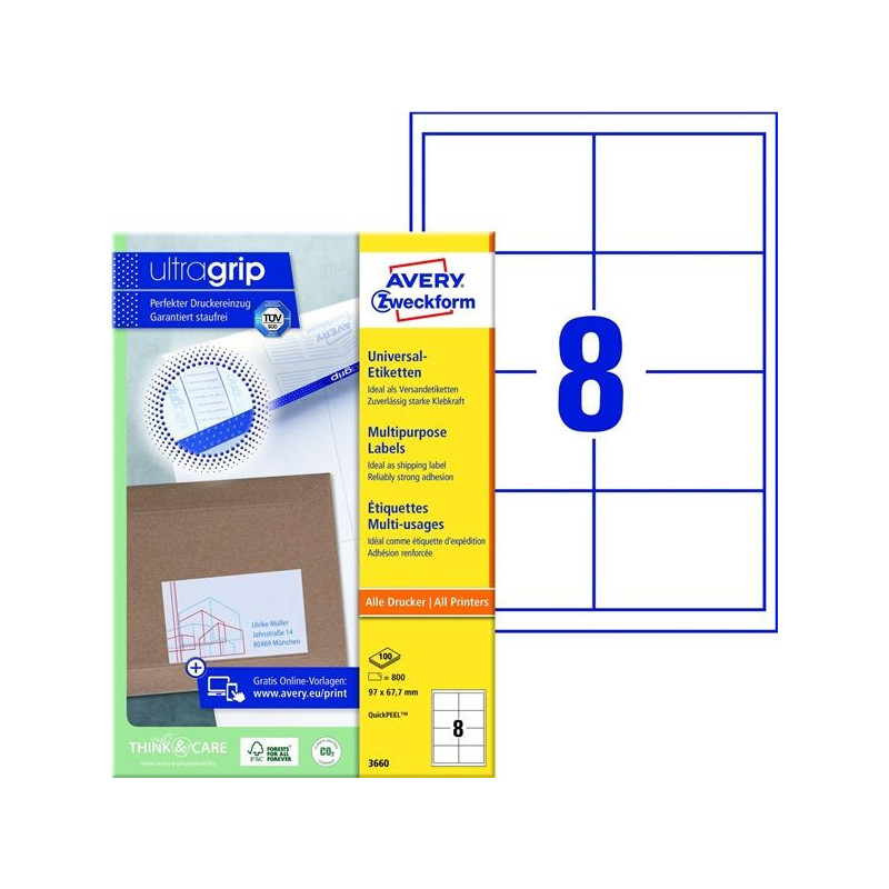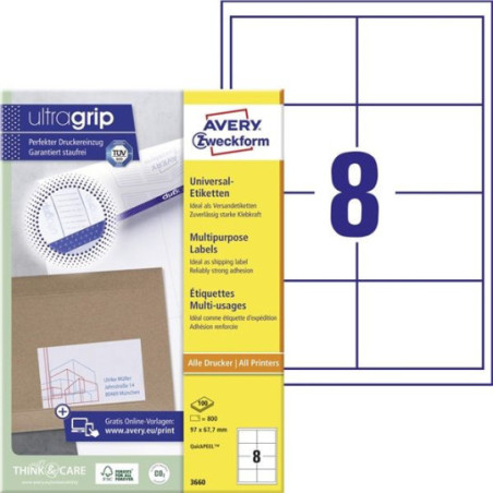 *Inovativní technologie ultragrip na zadní straně archu zajišťuje bezchybné natažení archu etiket a tisk bez zasekávání archu etiket v tiskárně *Univerzální bílé etikety jsou určeny pro každodenní použití na listovní zásilky a balíky, na označování, číslování, oceňování sortimentu či výrobků *Formáty A6, A5, A4 lze použít k nejrůznějším plošným aplikacím *Etikety mají speciální lemování, které zabraňuje zanášení tiskárny lepidlem *Na etikety se jednoduše tiskne a mají dlouhodobou přilnavost *Etikety jsou ekologicky šetrné a mohou být plně recyklovatelné jako součást běžného papírového odpadu *FSC certifikované etikety jsou vyráběny z papíru ze šetrně spravovaných a obnovitelných lesů *Vhodné pro inkoustové, laserové tiskárny a kopírovací stroje *Díky technologii QuickPEEL™ jsou etikety snadno snímatelné z archu *Online šablony a software zdarma ke stažení na www.avery-zweckform.cz