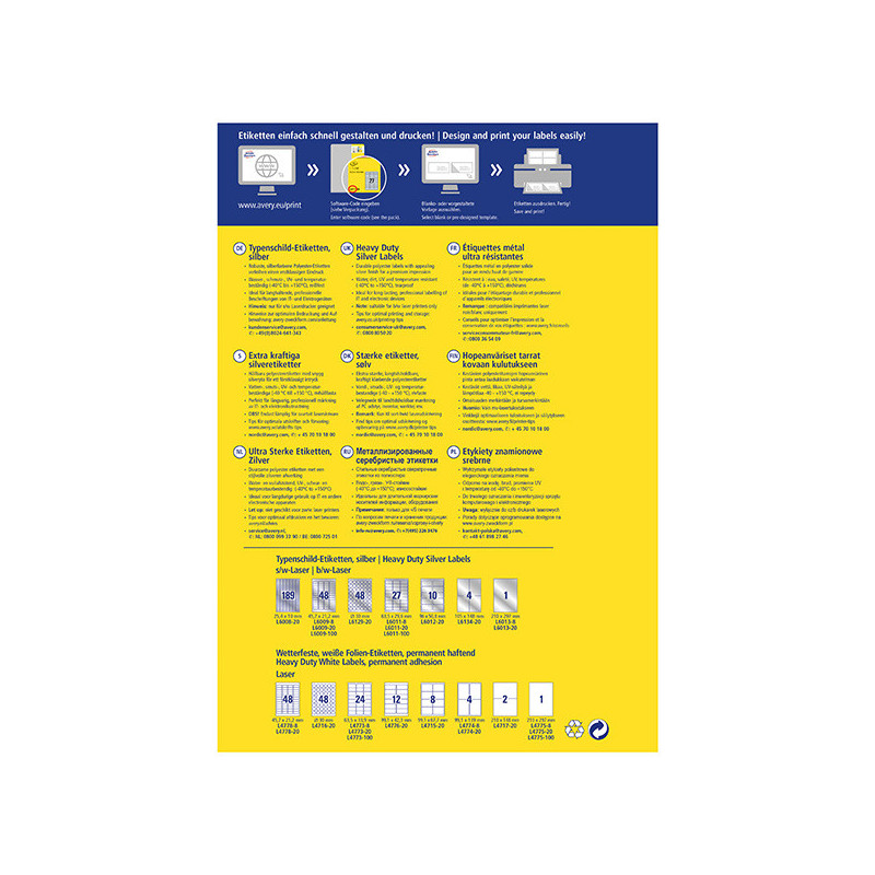 *Velmi odolné polyesterové etikety *Ideální pro trvalé označení majetku, výrobků varovné nápisy či instrukce *Odolné vůči prachu, natržení, vodě, UV záření a vlivům počasí a teplotním změnám -40 °C do +150 °C *Vhodné pouze pro černobílé laserové tiskárny *Na etikety lze psát propiskou či lihovým fixem - text je poté trvalý. Při použití fixu na bílé tabule lze text poté z etikety odstranit *Online šablony a software zdarma ke stažení na www.avery-zweckform.cz