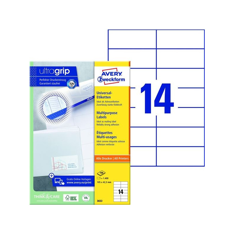 *Inovativní technologie ultragrip na zadní straně archu zajišťuje bezchybné natažení archu etiket a tisk bez zasekávání archu etiket v tiskárně *Univerzální bílé etikety jsou určeny pro každodenní použití na listovní zásilky a balíky, na označování, číslování, oceňování sortimentu či výrobků *Formáty A6, A5, A4 lze použít k nejrůznějším plošným aplikacím *Etikety mají speciální lemování, které zabraňuje zanášení tiskárny lepidlem *Na etikety se jednoduše tiskne a mají dlouhodobou přilnavost *Etikety jsou ekologicky šetrné a mohou být plně recyklovatelné jako součást běžného papírového odpadu *FSC certifikované etikety jsou vyráběny z papíru ze šetrně spravovaných a obnovitelných lesů *Vhodné pro inkoustové, laserové tiskárny a kopírovací stroje *Díky technologii QuickPEEL™ jsou etikety snadno snímatelné z archu *Online šablony a software zdarma ke stažení na www.avery-zweckform.cz