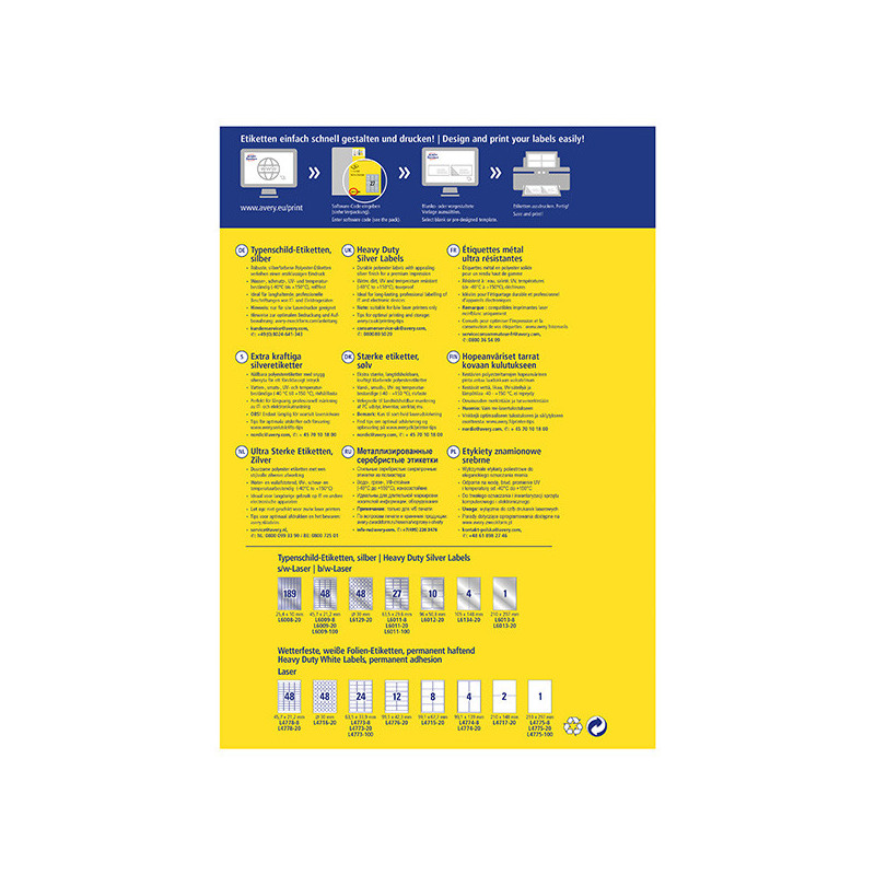 *Velmi odolné polyesterové etikety *Ideální pro trvalé označení majetku, výrobků varovné nápisy či instrukce *Odolné vůči prachu, natržení, vodě, UV záření a vlivům počasí a teplotním změnám -40 °C do +150 °C *Vhodné pouze pro černobílé laserové tiskárny *Na etikety lze psát propiskou či lihovým fixem - text je poté trvalý. Při použití fixu na bílé tabule lze text poté z etikety odstranit *Online šablony a software zdarma ke stažení na www.avery-zweckform.cz