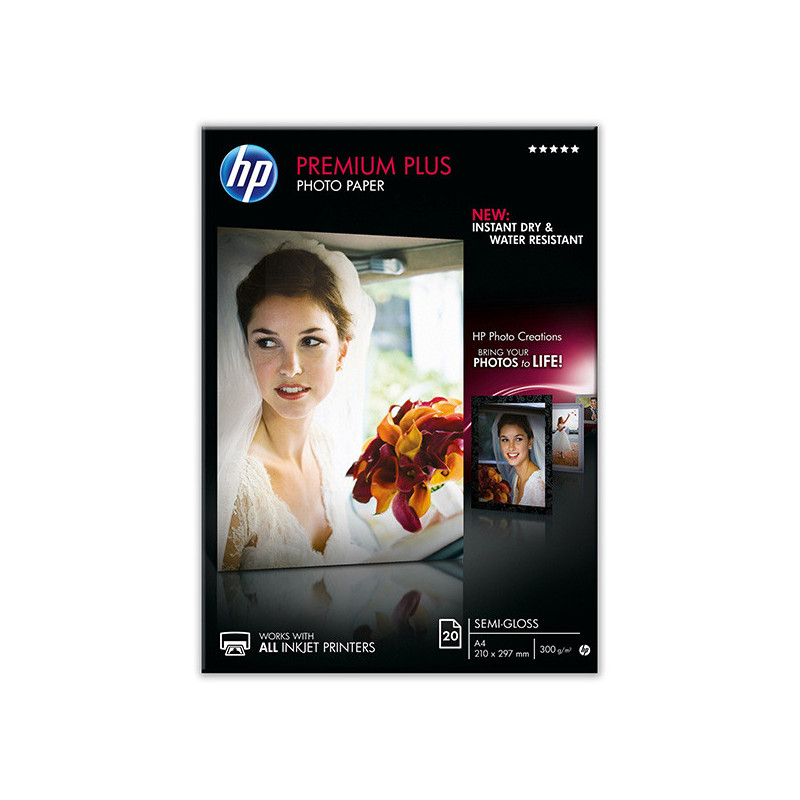• Tento papír špičkové kvality dodá vašim fotografiím profesionální vzhled v pololesklém provedení. Pochlubte se svými oblíbenými fotografiemi bez čekání – fotografie na fotografickém papíru HP Premium Plus bleskově schnou a jsou odolné proti vodě a rozpití.