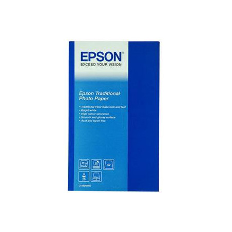 Epson Traditional Photo Paper představuje průlom ve výrobě papíru. Byl navržen speciálně pro použití s inkoustem Epson UltraChrome K3, a to ve spolupráci s mnoha čelními profesionálními fotografy tak, aby beze zbytku splnil jejich vysoké nároky.Mnozí, kteří se na vývoji fotopapíru Traditional Photo Paper podíleli, zdůraznili, že jim připomíná klasická halogenidostříbrná média a zároveň nabízí více kreativní kontroly díky mimořádné optické hustotě a reprodukci odstínů v černobílé. Kromě toho mohou na tom samém papíru tisknout ve vynikajících barvách, což na tradičních vláknitých papírech nebylo možné.V kombinaci umělecké formy tradiční fotografie a snadného zpracování a obsluhy digitálního výstupu přináší toto jedinečné médium stejně hluboké černé tóny, jemné přechody a trvanlivé výsledky jako za časů papírů vyvolávaných v temných komorách. Jeho vláknitý základ zdobí plný povrch, rovnoměrná hloubka barev a měkký lesk, díky kterým je ideální jak pro skutečně vybranou reprodukci barev, tak pro tisk v neutrální černobílé při zachování vzhledu a půvabu tradičních vláknitých papírů.Stejně jako ostatní inovativní média Epson je i tento papír navržen a vyroben tak, aby vám nabídl nejvyšší možné rozlišení a sytost barev. Spotřební materiály Epson jsou vždy zárukou prověřené kvality Epson.