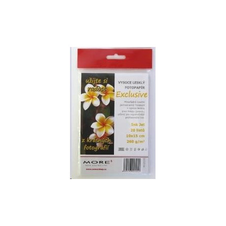 Fotopapír MORE M10532 Vysoce jakostní fotopapír s jednostranným vysoce kontrastním povrchem, určený pro profesionální tisk na inkoustových tiskárnách. Lesklý fotopapír formátu10x15cm. Gramáž 240g/m2. V balení 20 listů.
