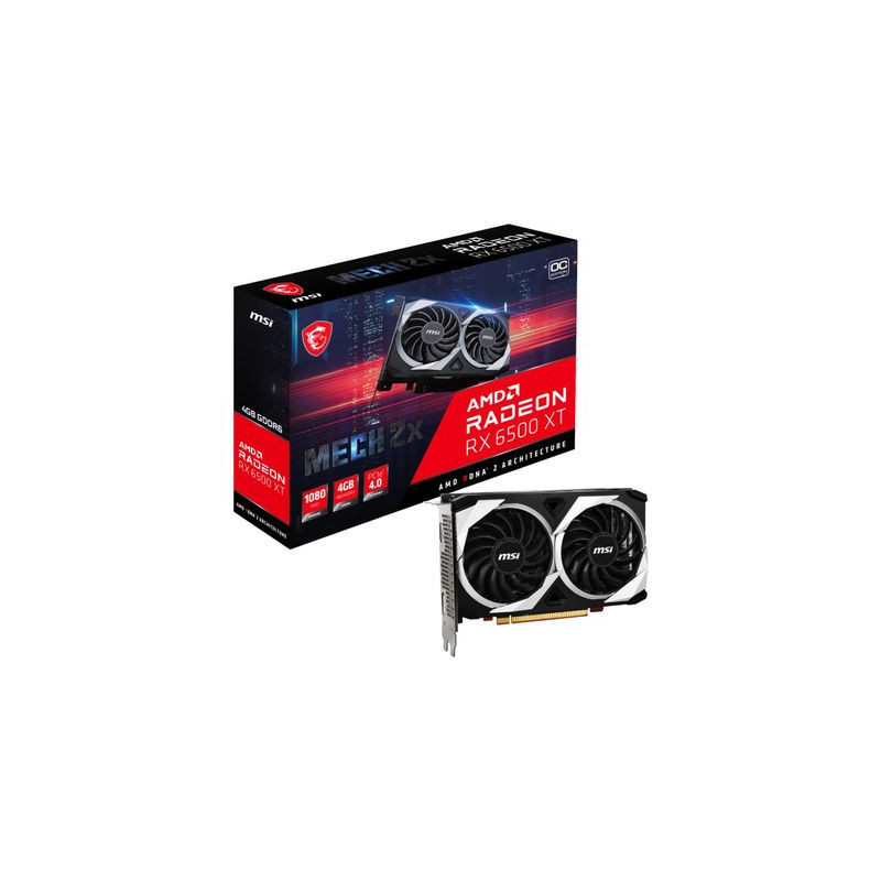 MSI RADEON RX 6500 XT MECH 2X 4G OC. Rodina grafického procesoru: AMD, GPU: Radeon RX 6500 XT. Paměť samostatné grafické karty: 4 GB, Typ paměti grafické karty: GDDR6, Šířka paměťového rozhraní: 64-bit. Maximální rozlišení: 7680 x 4320 pixelů. Verze DirectX: 12.0, verze OpenGL: 4.6. Rozhraní: PCI Express 4.0 Chlazení: Aktivní, Počet ventilátorů: 2 ventilátory
