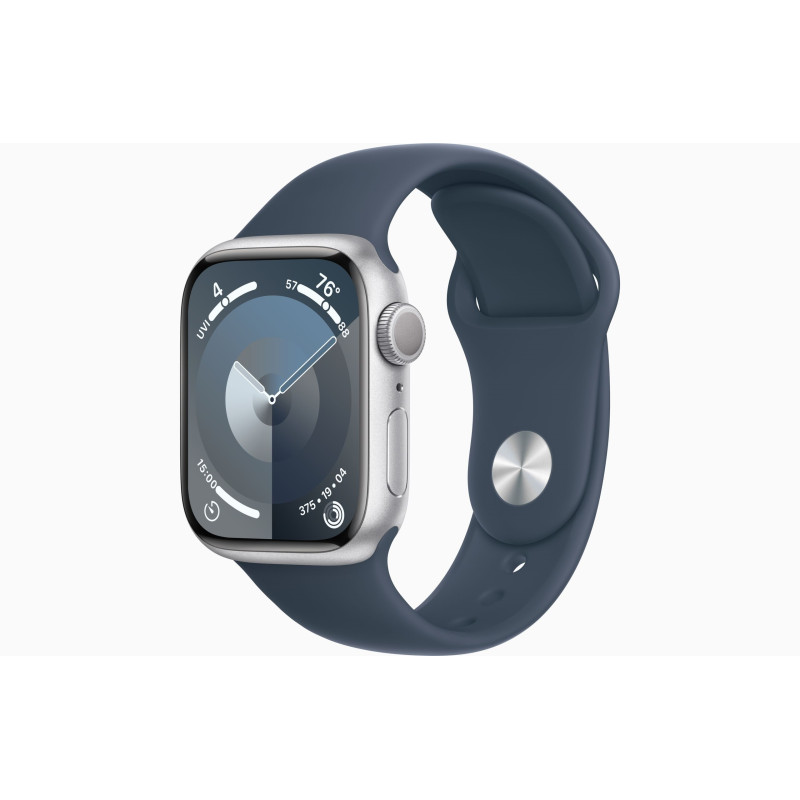 Apple Watch Series 9 • GPS • 41mm pouzdro ze stříbrného hliníku • Bouřkově modrý sportovní řemínek – S/M