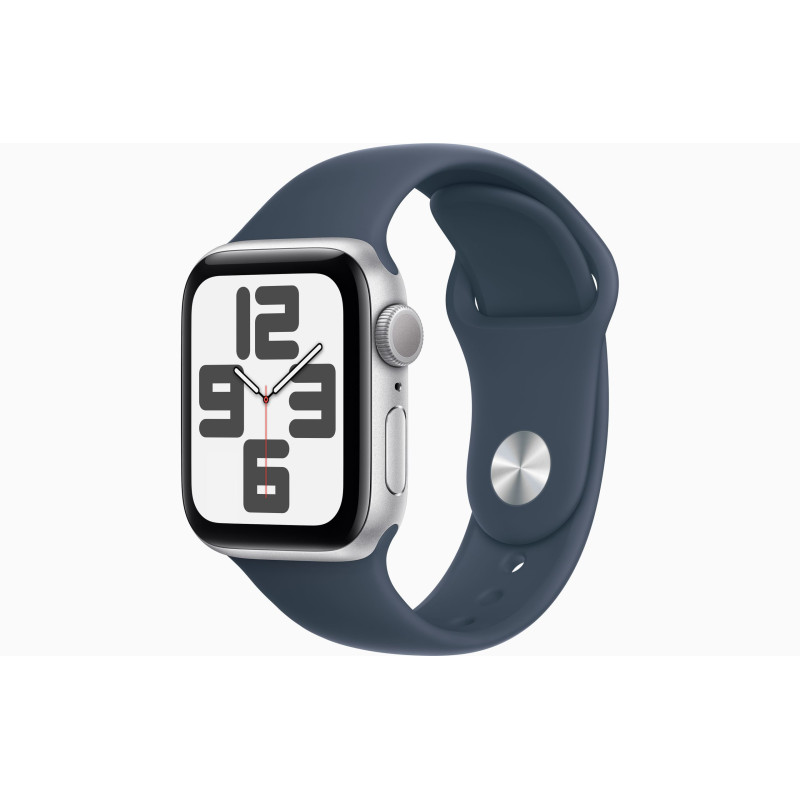 Apple Watch SE • GPS • 44mm pouzdro ze stříbrného hliníku • Bouřkově modrý sportovní řemínek – M/L