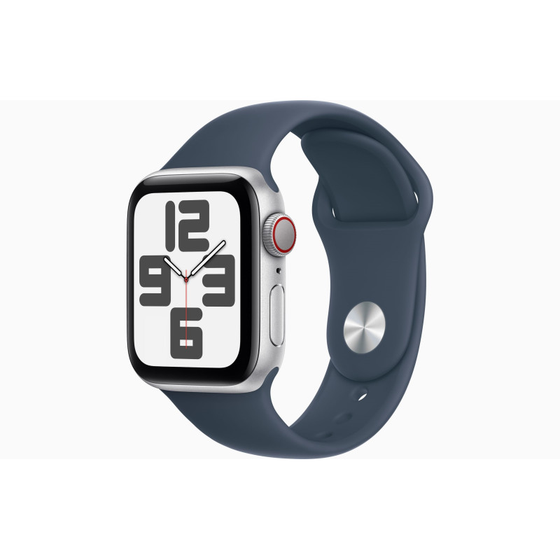 Apple Watch SE • GPS + Cellular • 40mm pouzdro ze stříbrného hliníku • Bouřkově modrý sportovní řemínek – S/M
