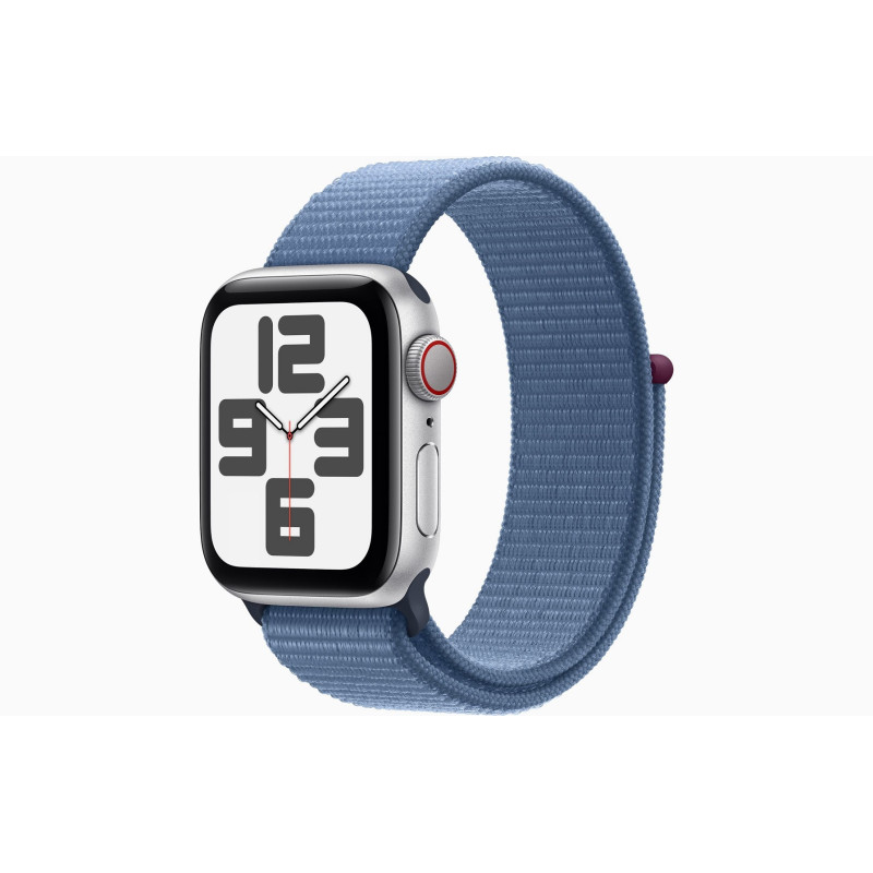 Apple Watch SE • GPS + Cellular • 44mm pouzdro ze stříbrného hliníku • Ledově modrý provlékací sportovní řemínek