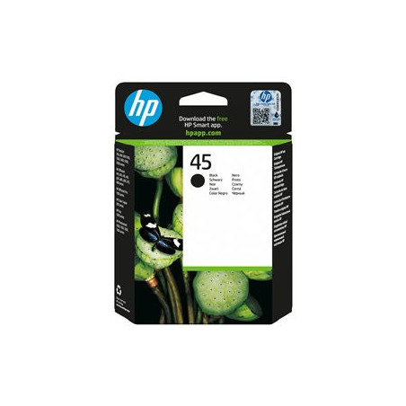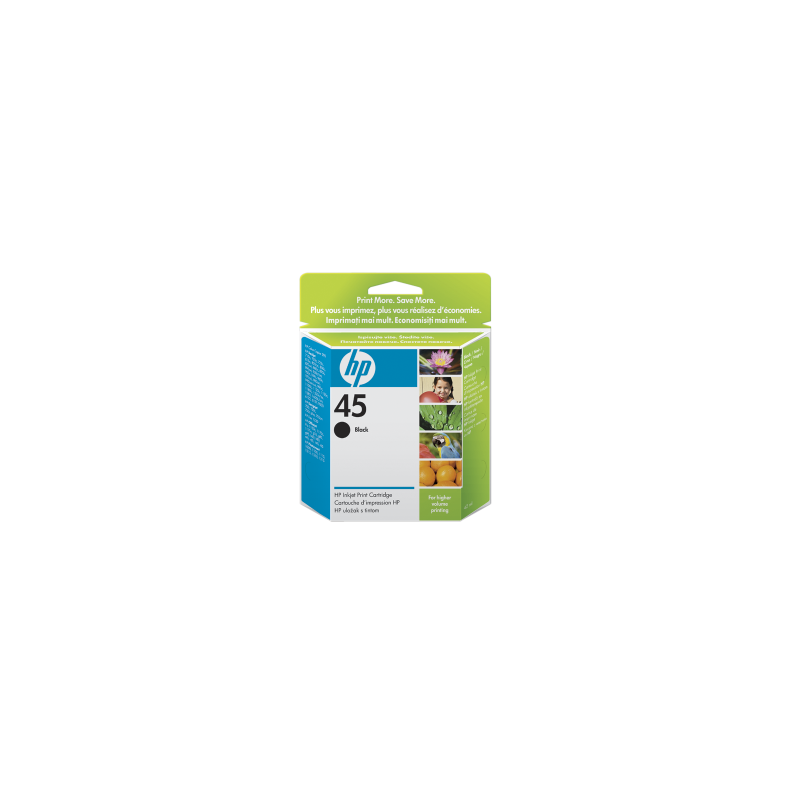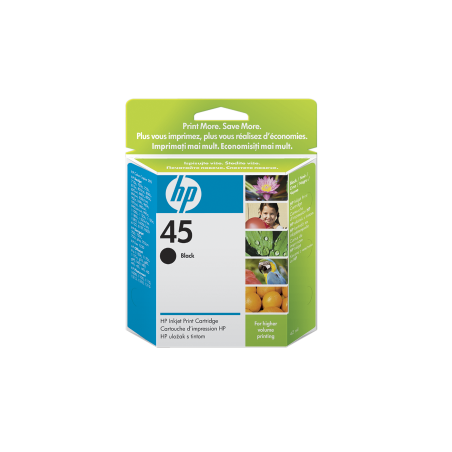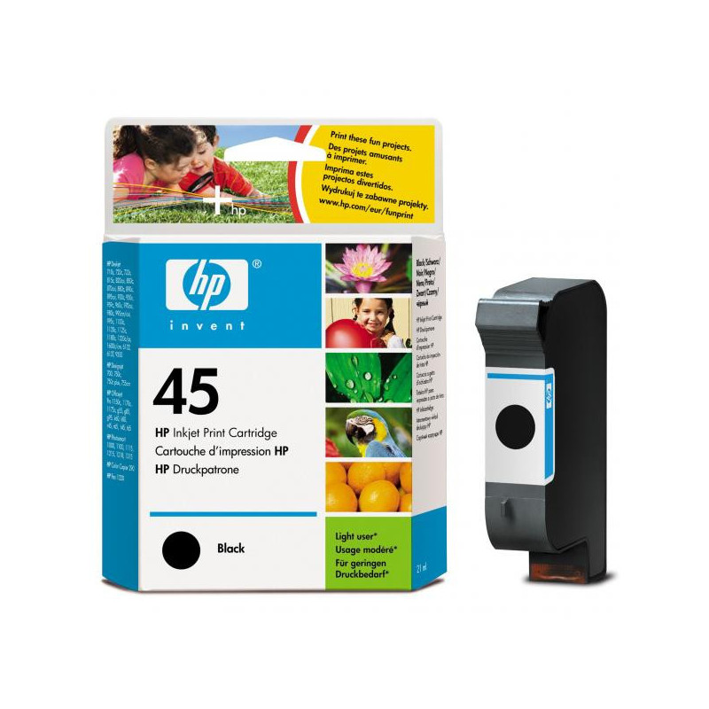 Černé inkoustové tiskové kazety HP 45 umožňují rozlišení 600 x 600 dpi a obsahují technologii pigmentového inkoustu, který podává výsledky nejvyšší možné kvality na tiskárnách HP Deskjet, Photosmart, Designjet a Officejet, především při tisku na papíry a fólie HP.