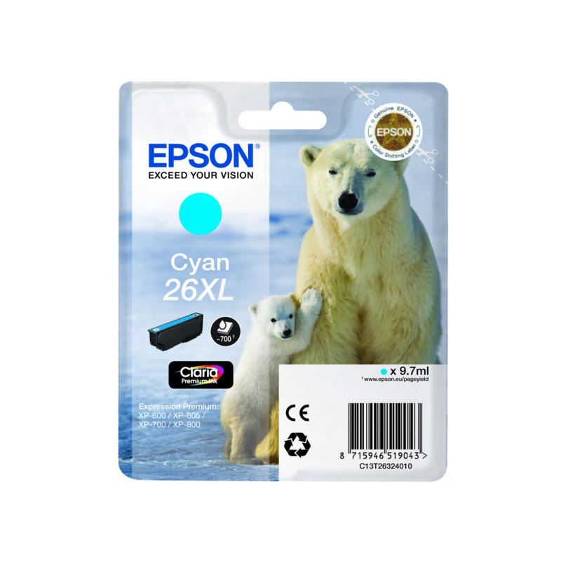 Epson originální ink C13T26324022, T263240, 26XL, cyan, 9,7ml, Epson Expression Premium XP-800, XP-700, XP-600