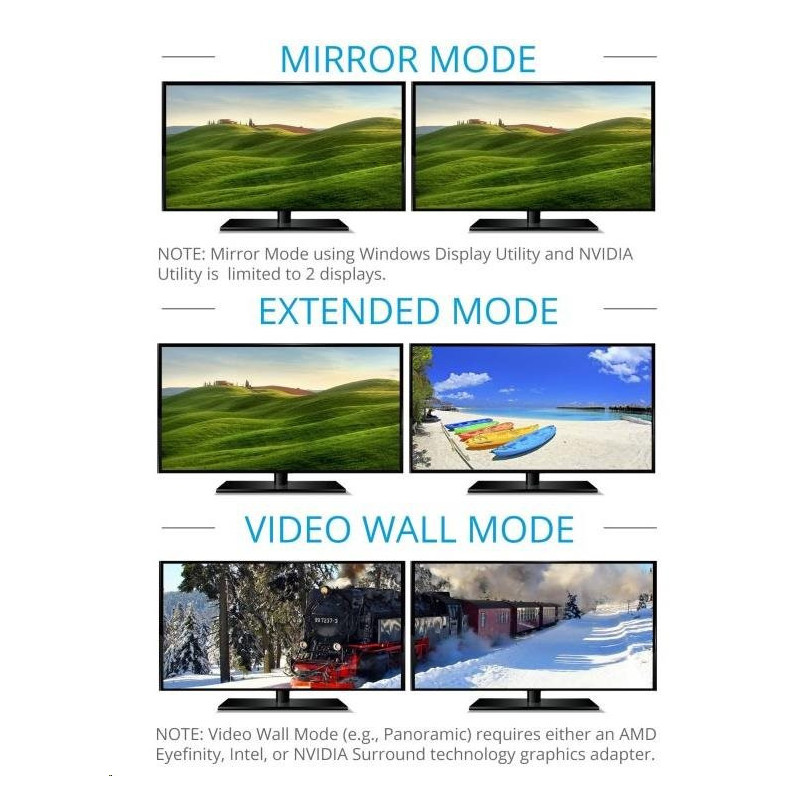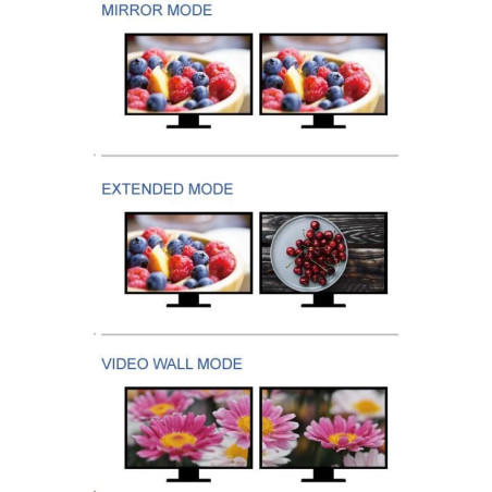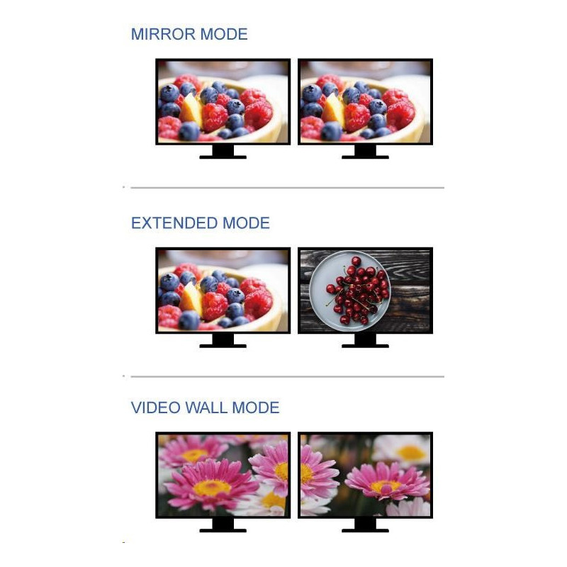 - Adaptér MST umožňuje použití tří módů: 1.Přenos dvou různých obrazů na dva monitory 2.Rozšíření jednoho obrazu na dvě obrazovky 3.Zobrazení dvou stejných obrazů na dvou monitorech