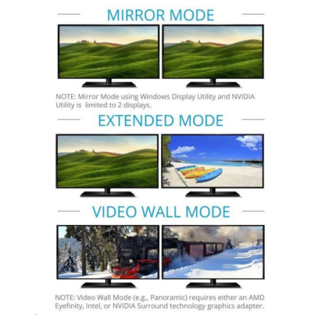 - Podmínkou pro správnou funkci je Displayport 1.2 a vyšší, který podporuje MST (multi stream transport)