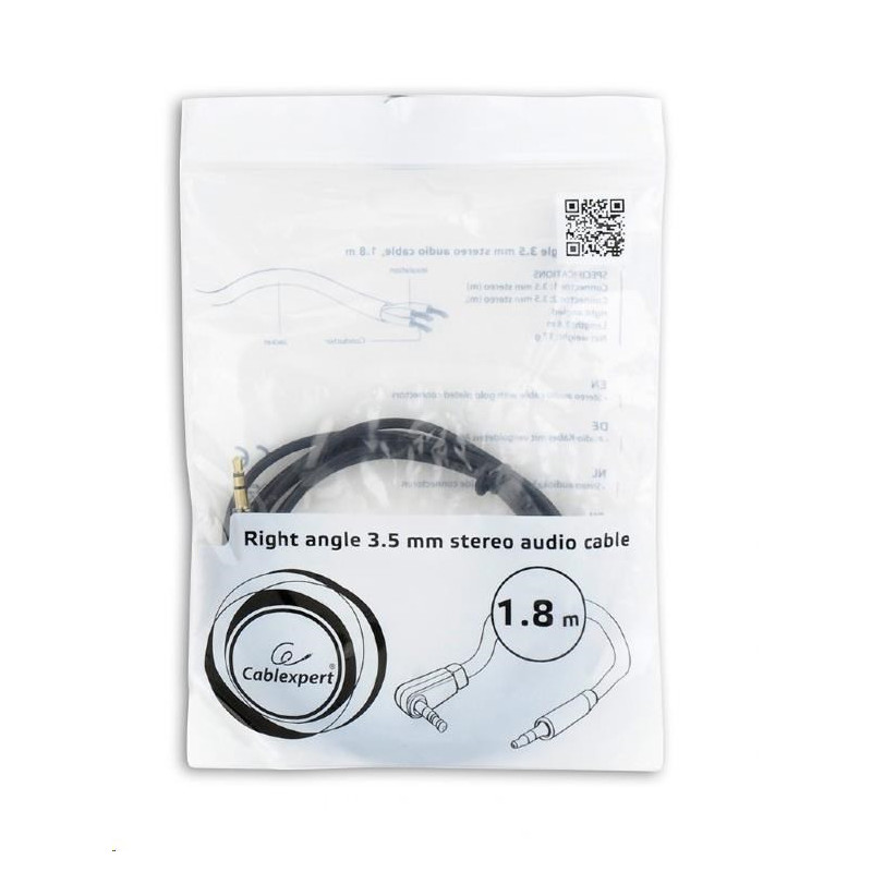 Stereo audio cable with gold plated connectorsConnector 1: 3.5 mm stereo (m)Connector 2: 3.5 mm stereo (m), right angledLength: 1.8 mNet weight: 17 g