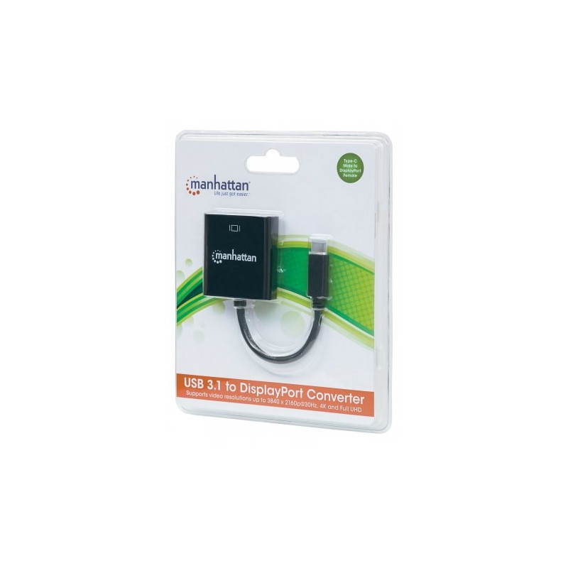 The Manhattan USB 3.1 to DP Converter establishes a fast, simple and convenient link between newer USB type-C equipped media sources (computers, tablets, etc.) and existing DisplayPort displays (monitors, projectors and more). The Manhattan USB 3.1 to DP Converter is easy and quick to install--no complicated configuration or setup required. Its all-in-one design achieves a compact, integrated solution that eliminates unnecessary cables, tangles and clutter to keep installations and work spaces neat and orderly. Extend the service life of your equipment, and fully realize the investment and value of your DP displays, projectors and peripherals with USB to DP converters.