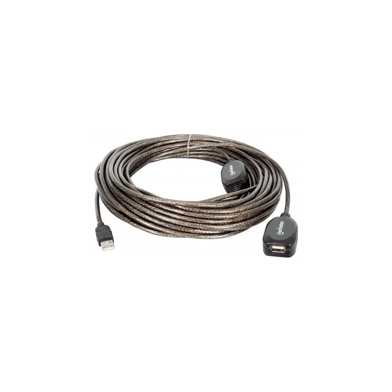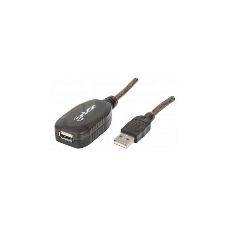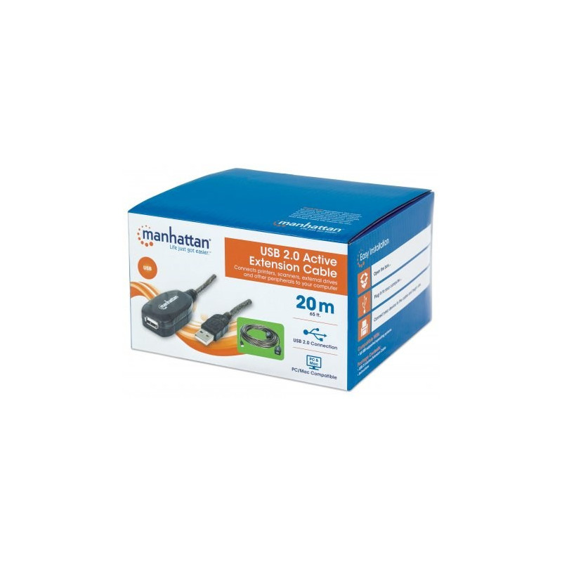 Use the Manhattan Hi-Speed USB Active Cable to connect a computer USB port to a USB device almost anywhere in the room. Daisy-chain 2 cable extensions to provide a convenient, 40m (131-ft.) connection. Manhattan Hi-Speed USB Active Cable with built-it repeater is fully-compliant with USB 1.1 and Hi-Speed USB specifications to help devices operate at maximum performance. Plug-and-play capability, Windows/Macintosh versatility and no external power or driver requirements help provide greater flexibility in computer and peripheral placement and office layout.