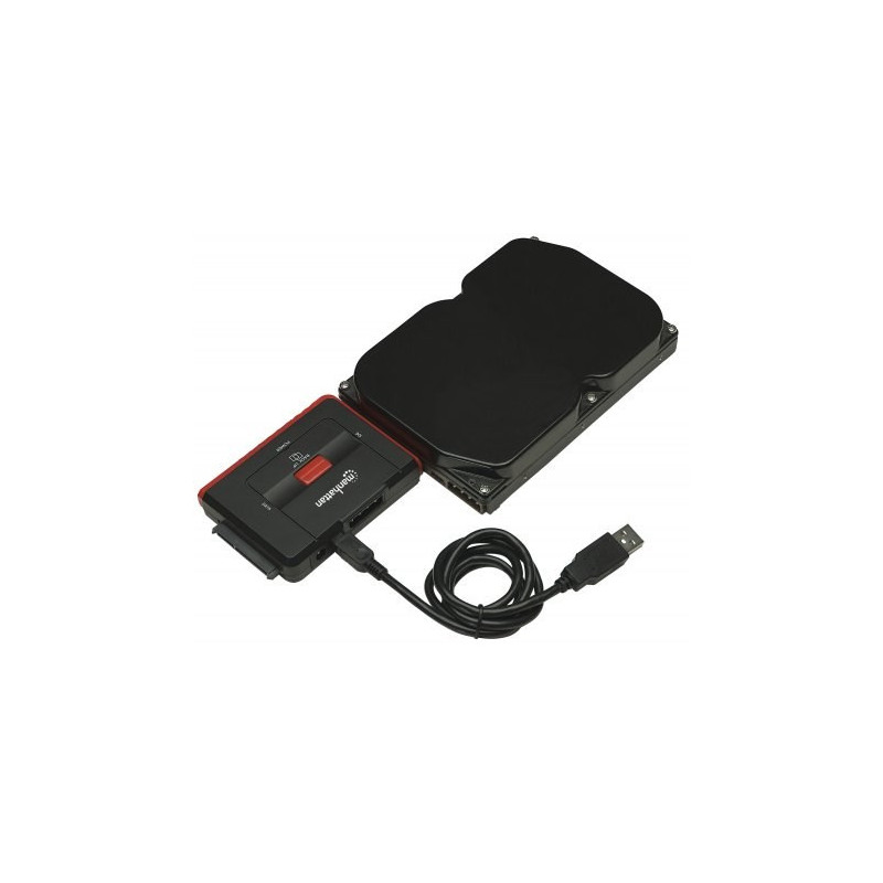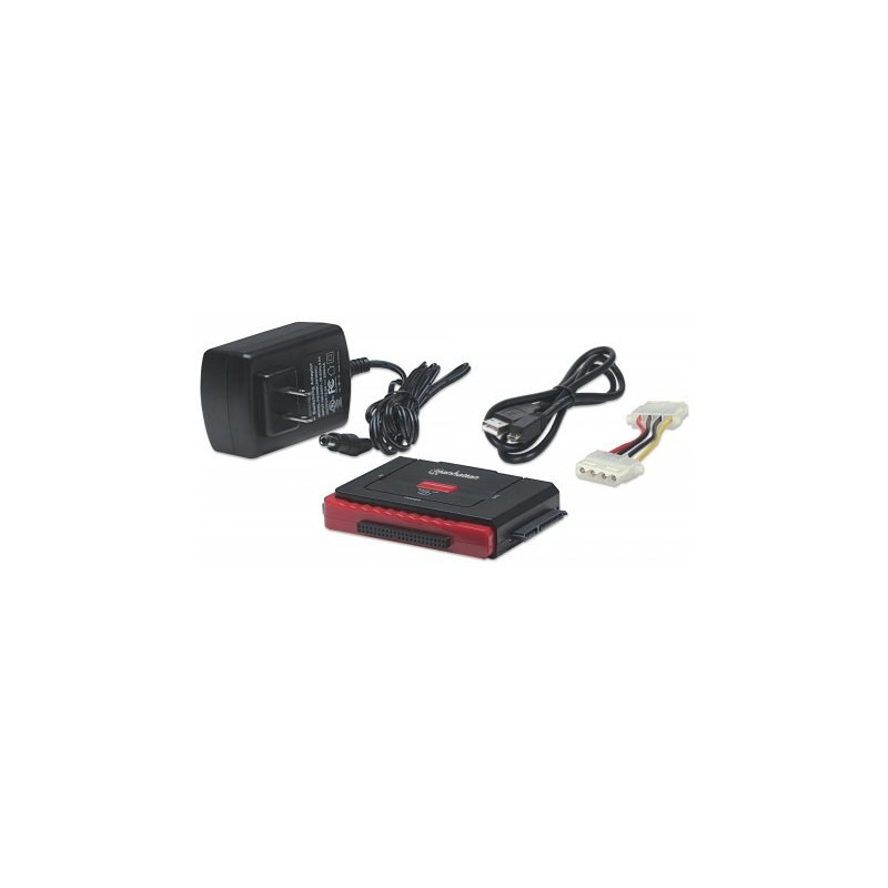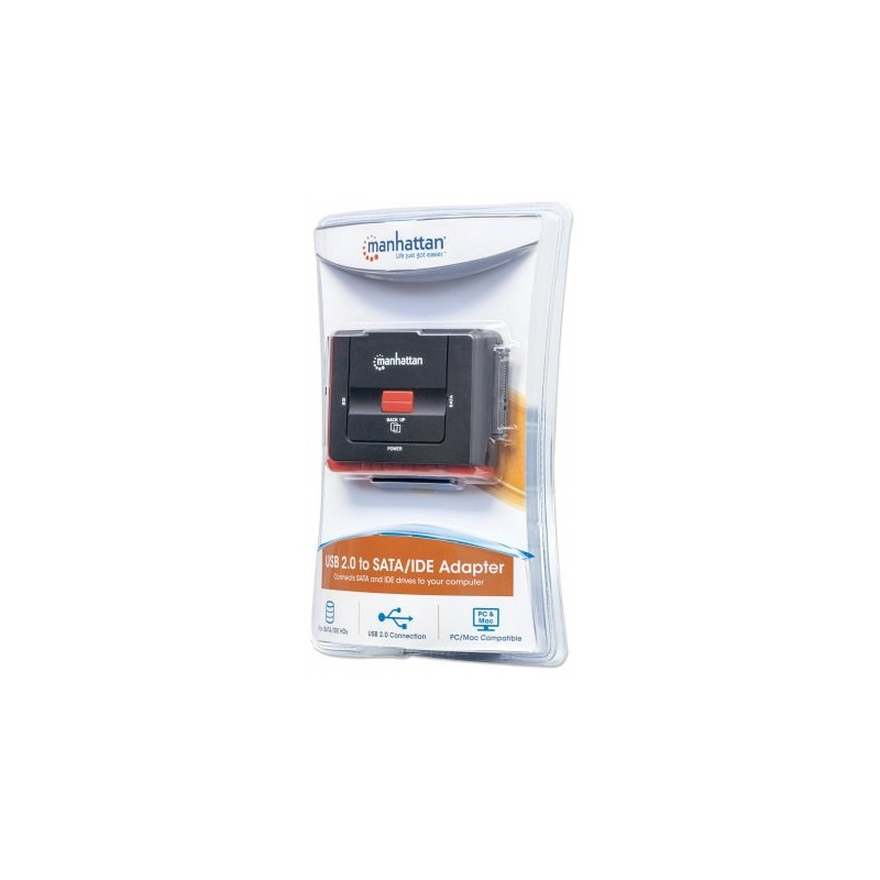The Manhattan Hi-Speed USB to SATA/IDE Adapter with Power Supply connects SATA, SATA-enhanced, IDE and enhanced-IDE hard disks to desktop and notebook computers using a USB port. Transferring and sharing files between desktop and notebook computers, backing up files or storing large file archives on external drives is faster and easier to accomplish. Serving as a bridge, the adapter can transfer data between SATA and IDE external drives when both are simultaneously attached. Compatibility with all types of hard drives up to 5.25" — including 2.5" notebook computer drives and standard 3.5" hard drives — makes this a versatile tool for professional and home users.