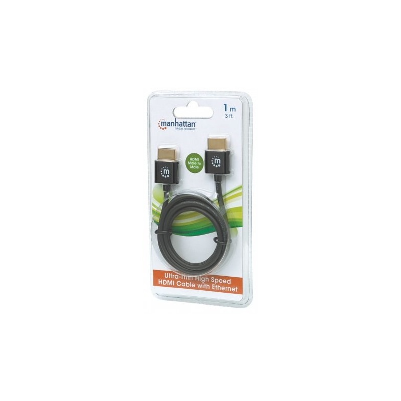 HDMI has become the standard digital connection, delivering the highest-quality audio and video signal over a single cable. With an ultra-thin, tangle-resistant design, gold-plated contacts and a sturdy yet slim PVC jacket, Manhattan Ultra-thin High Speed HDMI Cables are carefully constructed to meet the evolving needs of the ultra high-definition marketplace. Manhattan High Speed HDMI Cables provide the highest resolution possible at 4K x 2K, an audio return channel and a bandwidth of 18 Gbps at 600 MHz. These high-quality cables provide ultra high-definition video and multichannel, digital audio with increased performance characteristics and greater accuracy. Expanded features include Internet connectivity for home entertainment devices using a single HDMI connection. Plus, this cable's unique design makes it easy to handle and shape without worrying about snags and tangles.