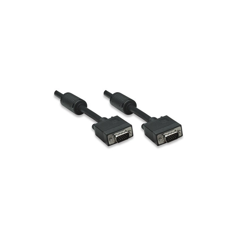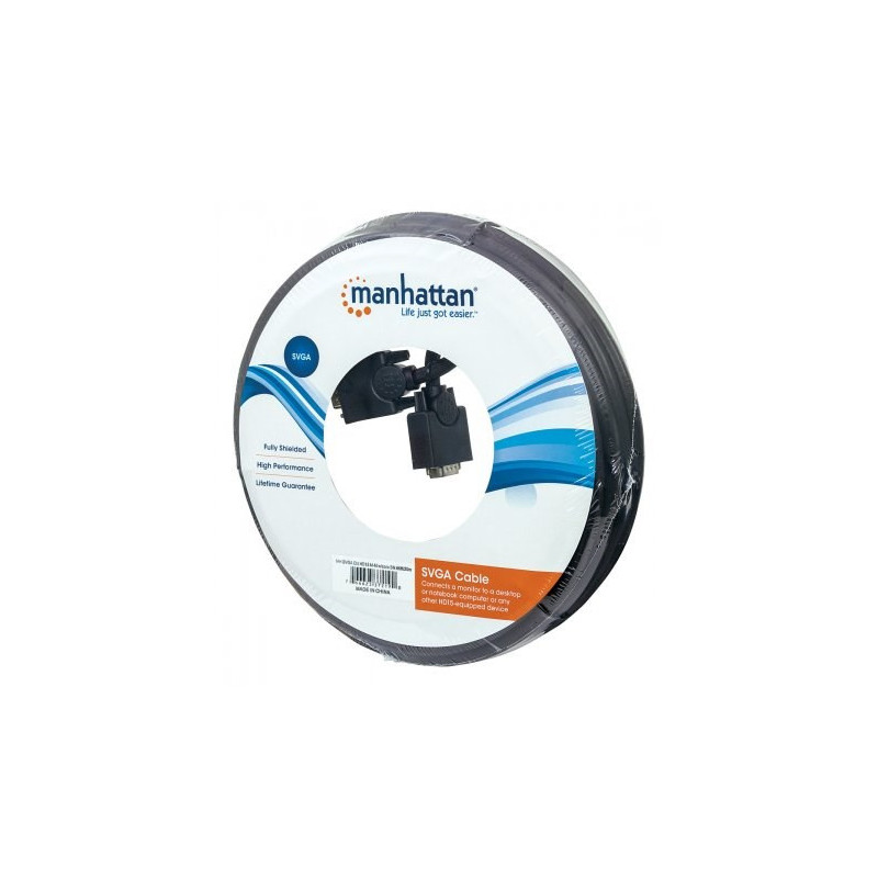Manhattan SVGA Cables easily connect a monitor with a desktop or notebook computer. Ideal for use with video splitters, KVM switches and any HD15-equipped display, computer or device, Manhattan SVGA Cables are engineered and constructed of quality materials to deliver dependable transmissions in video applications. Full foil and braided shielding with ferrite cores help minimize EMI interference and mini-coax (RGB) with paired video wire construction combine to provide maximum conductivity and clear, crisp images with reduced distortion over extended distances.