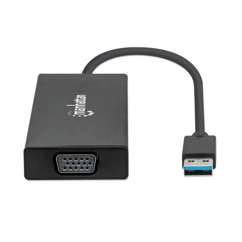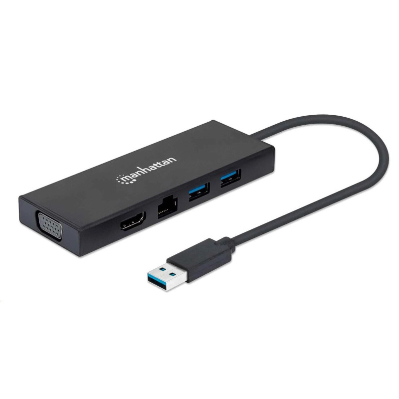 The Manhattan SuperSpeed USB Dual Monitor Multiport Adapter turns your USB device into more complete and accessible hardware. It helps you do more with the devices you already have to increase productivity nearly anywhere you are. This multiport adapter helps you expand your workspace or share what you're working on with an included 2048x1152@60Hz HDMI port that connects to your existing HDMI display (or monitor, projector, etc.) and a 2048x1152@60Hz VGA port that connects to a legacy VGA display. Both displays can be used simultaneously. You can add up to two peripherals, such as a mouse, keyboard, hub, external memory device and more, with its two SuperSpeed USB-A ports. And if you need a wired connection to a network, it offers gigabit speeds at its built-in Ethernet port. This adapter is a perfect companion to MacBook and other computers since it expands your access to devices through one USB port.
