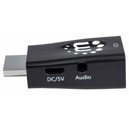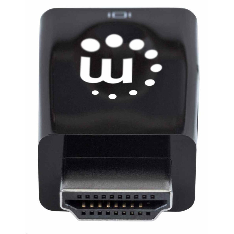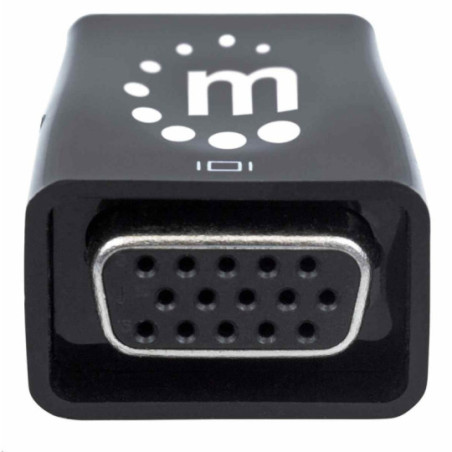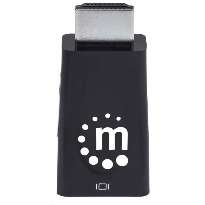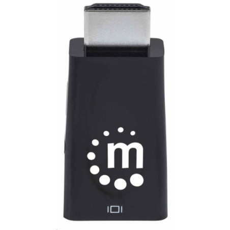 The Manhattan HDMI to VGA Micro Converter establishes a fast, simple and convenient link between a newer HDMI-equipped desktop, notebook computer or other media source and an existing VGA monitor, projector or other display device. The Manhattan HDMI to VGA Micro Converter is easy and quick to install and requires no complicated configuration or setup. This converter helps extend the service life of legacy VGA display equipment so you can get the most out of your investment and fully realize its value. The Manhattan HDMI to VGA Micro Converter offers a low-power, cost-effective and reliable solution so users can transition to HDMI bandwidths, resolutions, Deep Color and more without the expense of upgrading to newer and costly monitors and projectors. Its integrated, all-in-one design helps achieve a compact, integrated solution that eliminates unnecessary cables, tangles and clutter to keep installations and workspaces neat and orderly. Its 3.5 mm stereo port allows the converter to transmit audio to an external audio device, and its Micro-USB port allows for additional power if required.