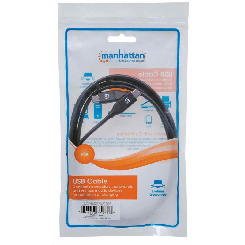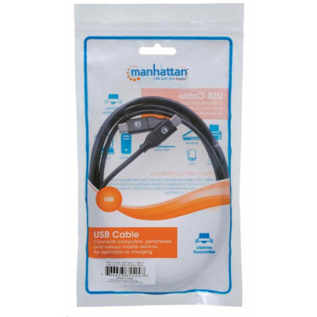 The Manhattan Hi-Speed USB-C Device Cable easily connects a USB peripheral and accessory with a USB-C peripheral or accessory. This cable supports fast, reliable data transfer rates up to 480 Mbps on Windows and Mac systems and current up to 5 amps (100 W). Nickel-plated contacts, shielding and fully molded boots with strain relief provide dependable connections, maximum conductivity and minimal data loss with reduced EMI interference.