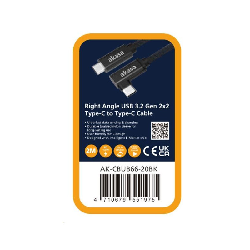SuperSpeed USB Type-C to right angle Type-C cable handling up to 20Gbps data transmission and 100W Power delivery (PD). Supports DisplayPort alternate mode for 4K@60Hz video function. Length of 2m.